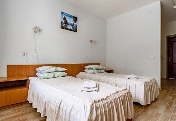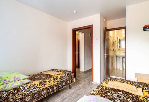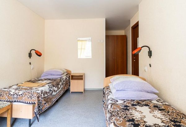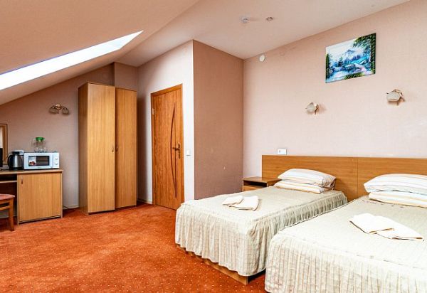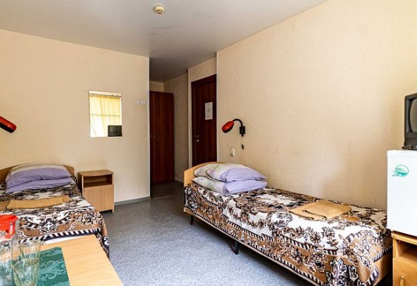 В номере: две отдельно стоящие односпальные кровати, шкаф, холодильник, телевизор. Санузел: душ, умывальник, туалет.