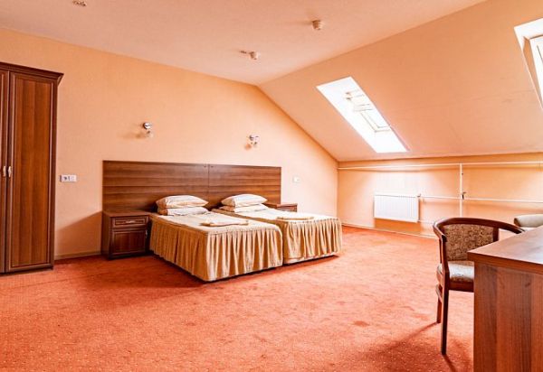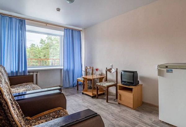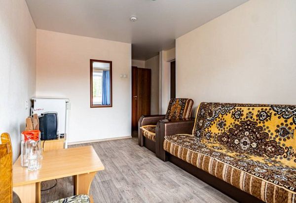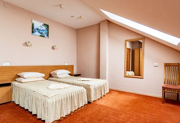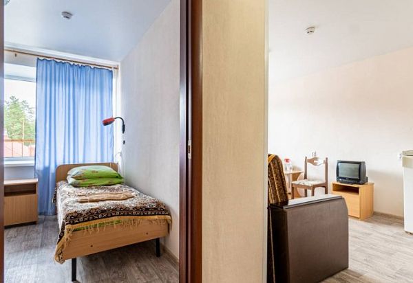 Просторный двухкомнатный номер. Номер состоит из спальни и гостиной. В спальне: две односпальные кровати, тумбы. В гостиной: диван, шкаф, холодильник, телевизор. Санузел: ванна, туалет, умывальник.