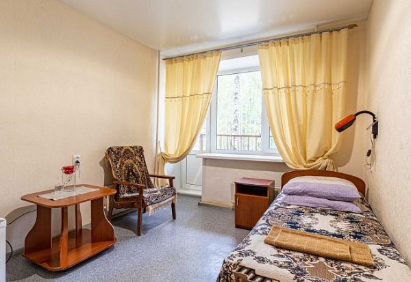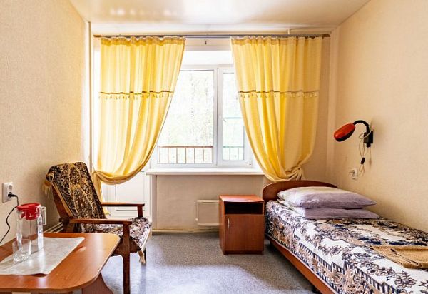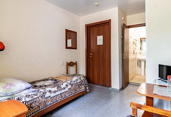 Стандартный однокомнатный, одноместный номер. В номере: одна односпальная кровать, тумбочка, телевизор, шкаф, холодильник. Ванная комната: душ, туалет, умывальник.