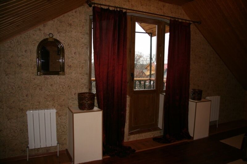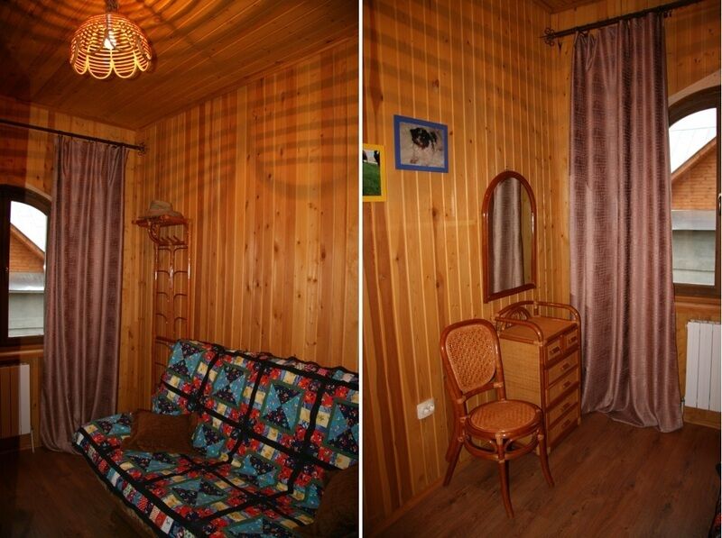 Вверх по лестнице - три спальни. В одной из них двуспальная кровать, в остальных - раскладывающиеся новые диваны. Во второй спальне может удобно разместиться семья из 3-х человек (двуспальный и полутора спальный диваны). В третей спальне – двуспальный диван. Всего в комнатах второго этажа с комфортом могут разместиться 7 человек. На втором этаже так же есть санузел с душевой кабиной.