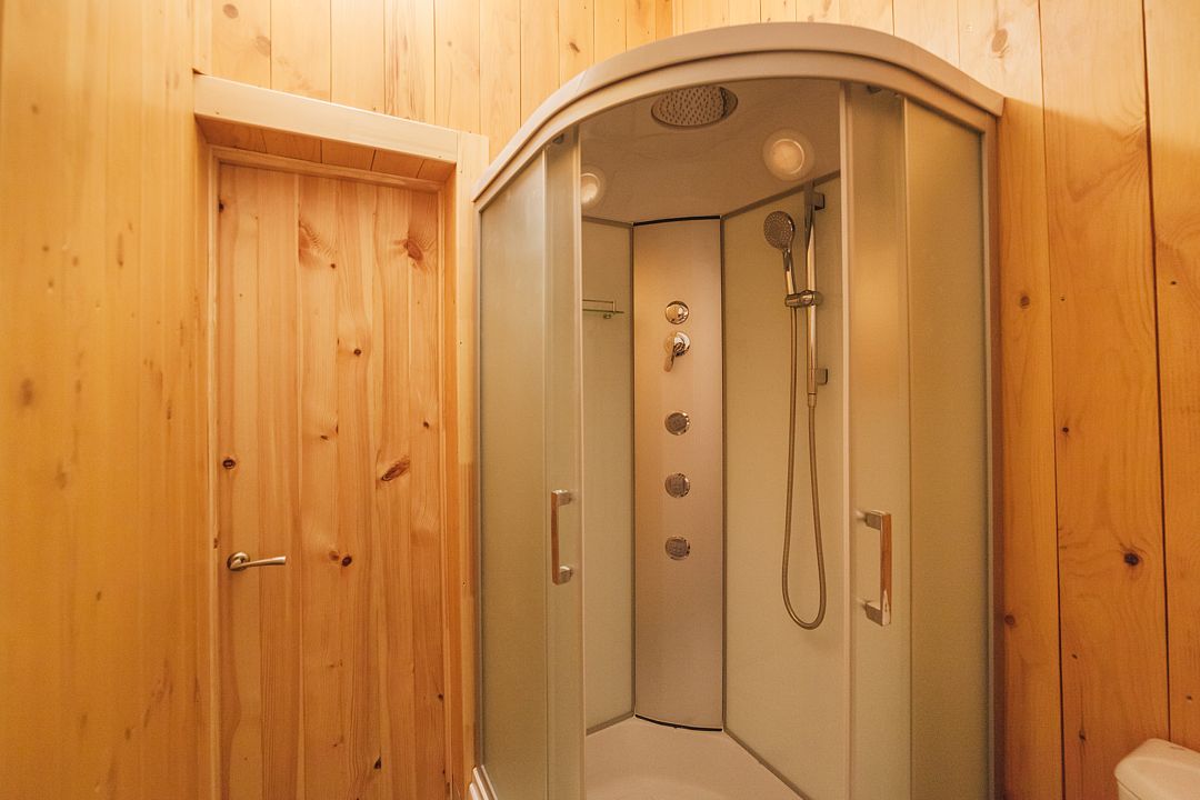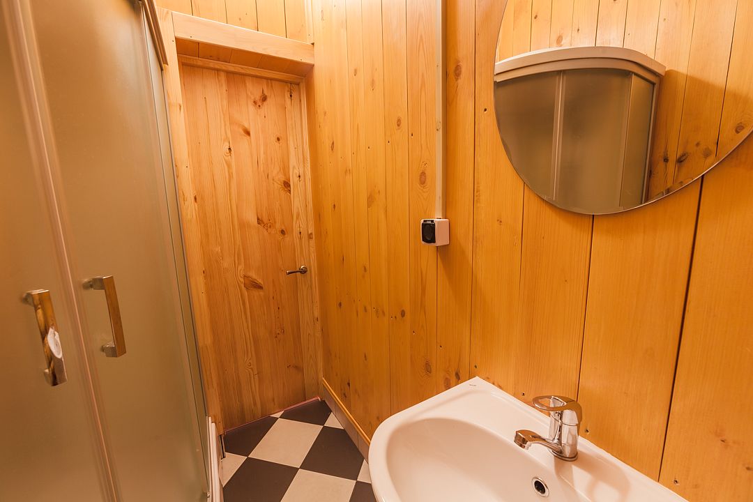 Четырёхместный номер (с двуспальной кроватью и двуспальным раскладным диваном) с санузлом и душевой кабиной.