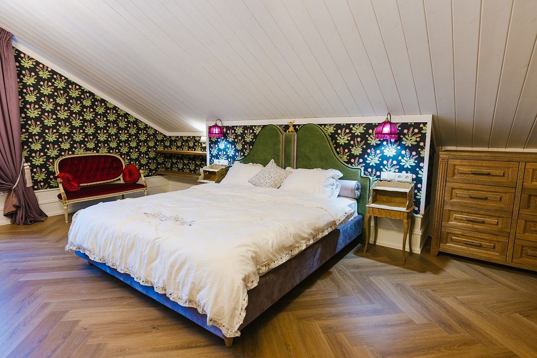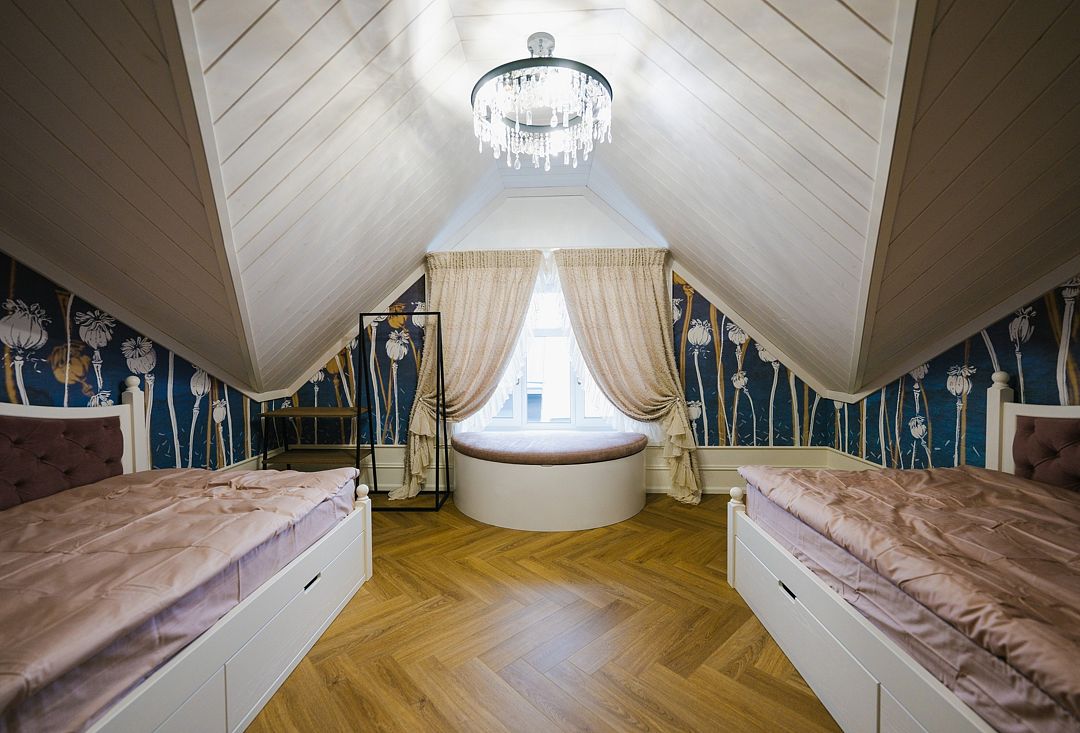 В доме три полноценные спальни с двуспальными кроватями и одна спальня с двумя полуторными кроватями.