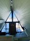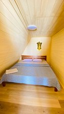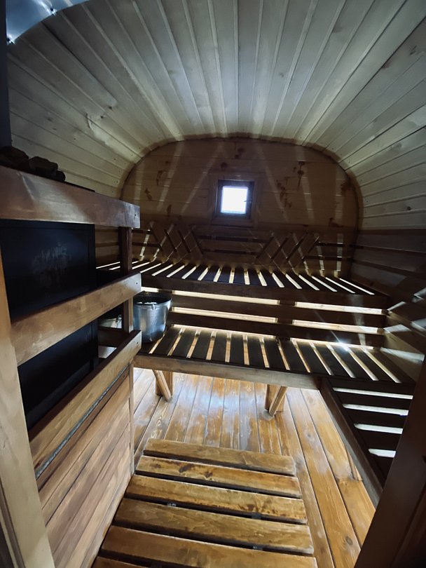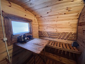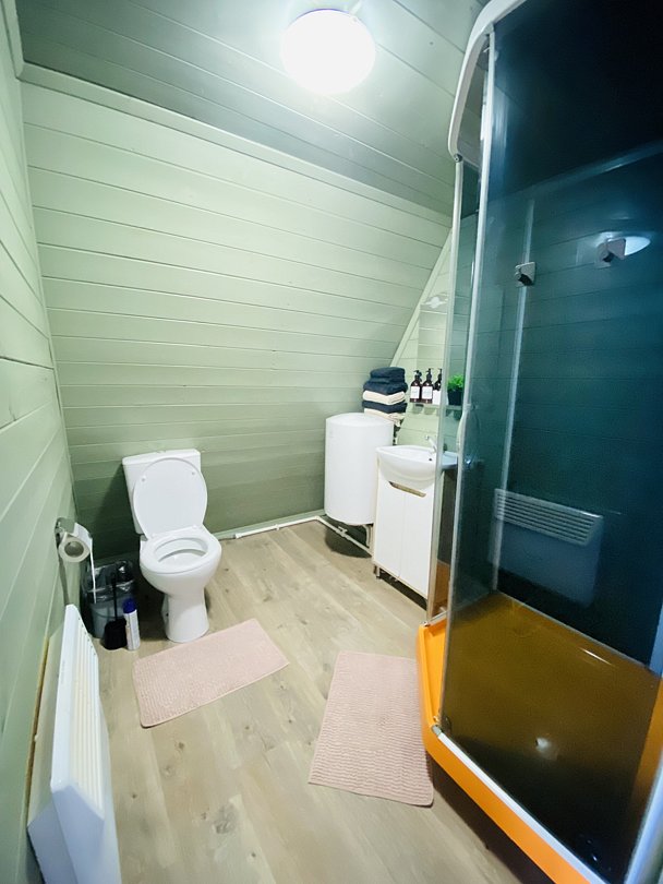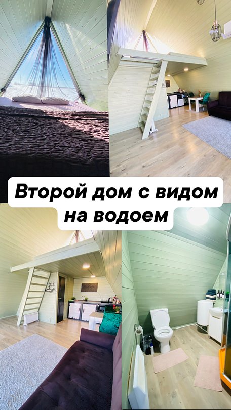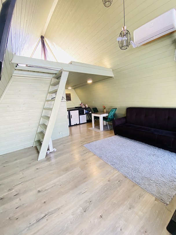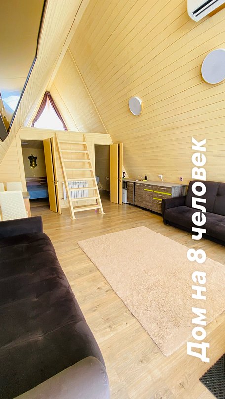 Дом 25 квадратных метров, санузлом, душем, кухней, двуспальным местом на втором этаже 5 квадратных метров, с панорамными окнами, отдельным входом и выделенной беседкой с мангалом.