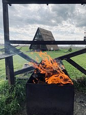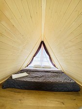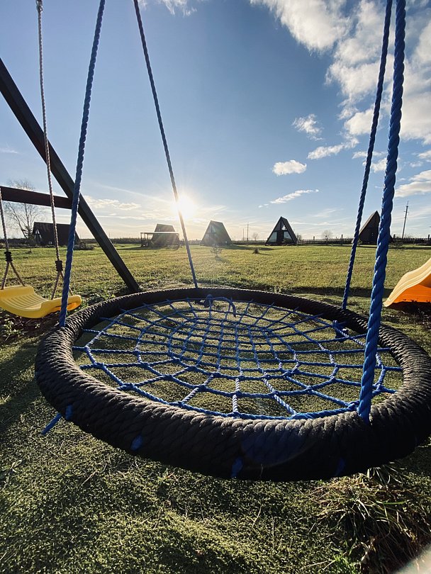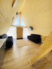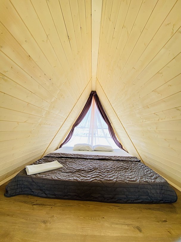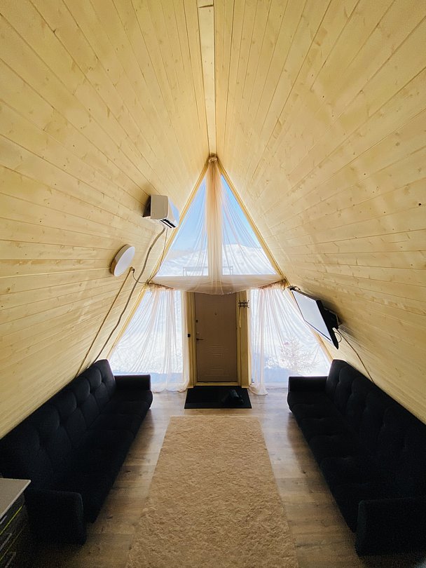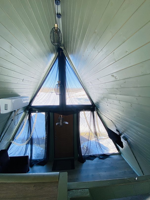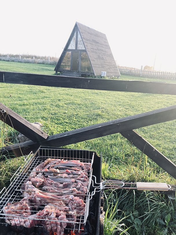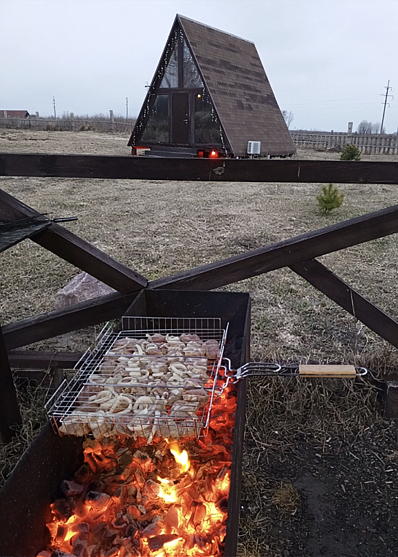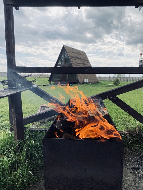 Дома с панорамными окнами полностью подготовлены для комфортного проживания. В каждом А-фрейме есть санузел с душем, кухня, двуспальное место на втором этаже. Имеется все необходимое для приготовления пищи: посуда, индукционная плита, чай, специи, сахар, соль, микроволновка, холодильник. К каждому дому предоставляется беседка с мангалом.