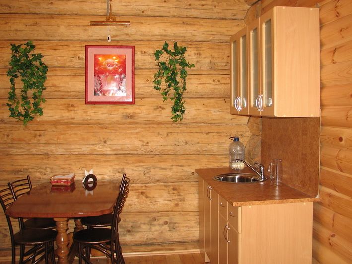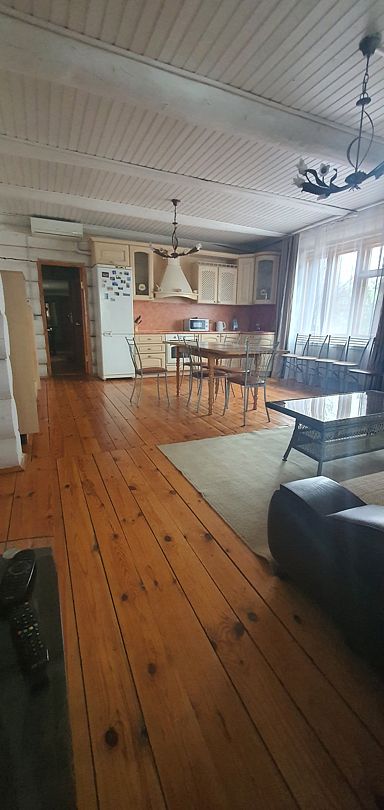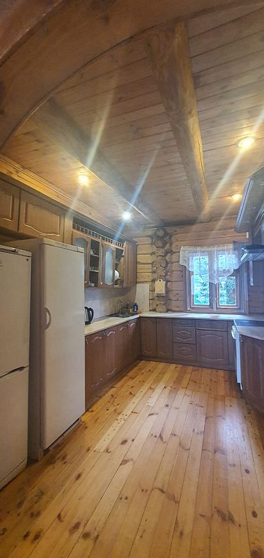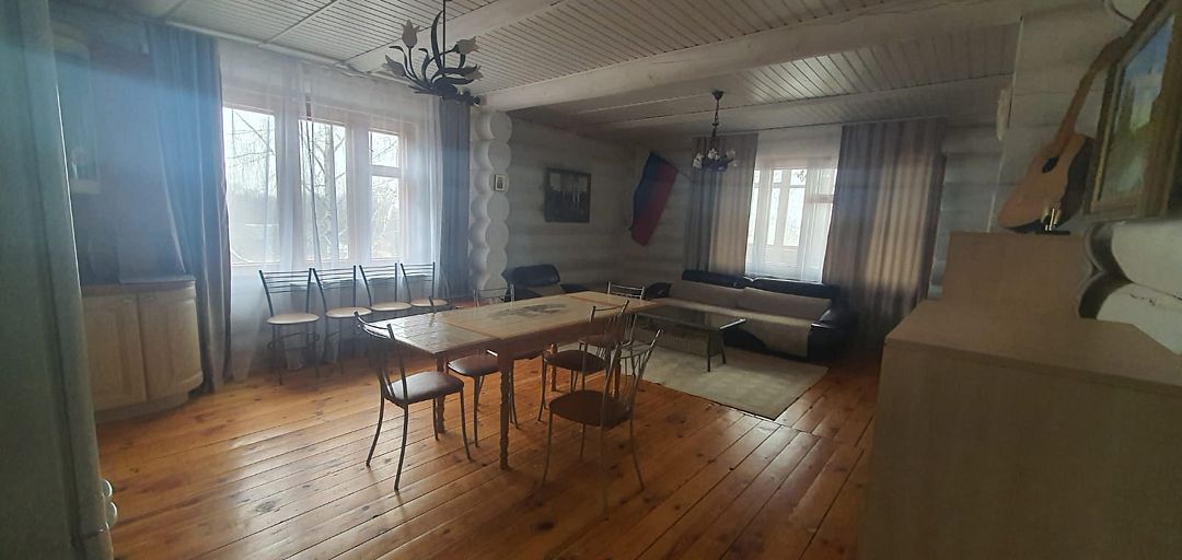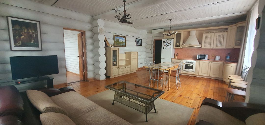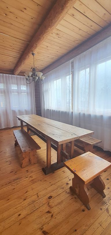 - обедня с кухонным столом, рассчитанным на всех гостей дома, с расположенными по всему периметру окнами с прекрасным видом на территорию базы отдыха и речку Клязьму;