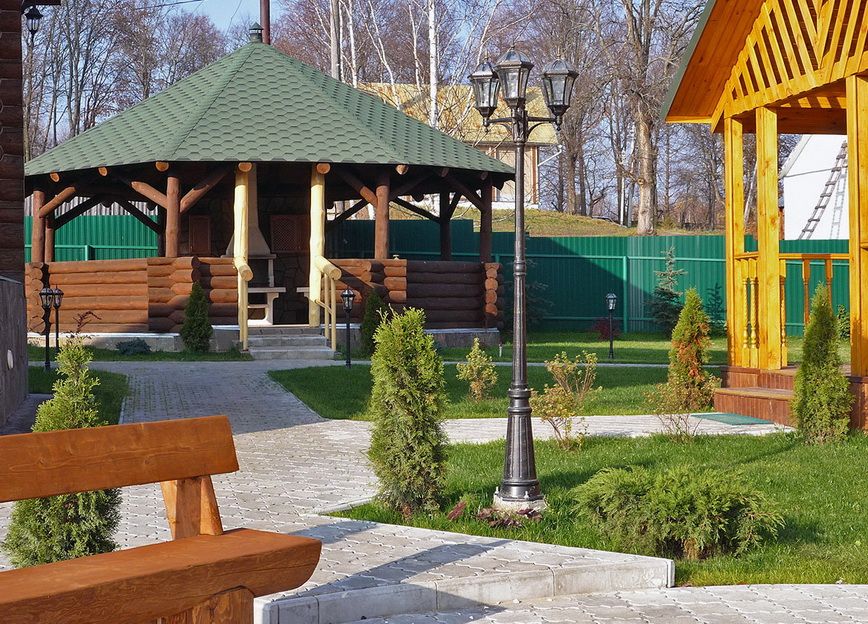 В баню можно зайти как и из территории двора, где расположена беседка-сруб, так и из самого гостевого номера.