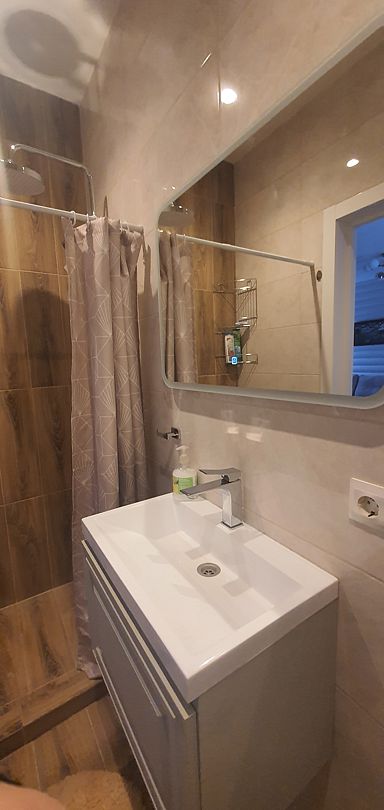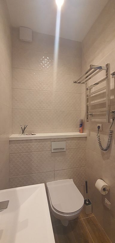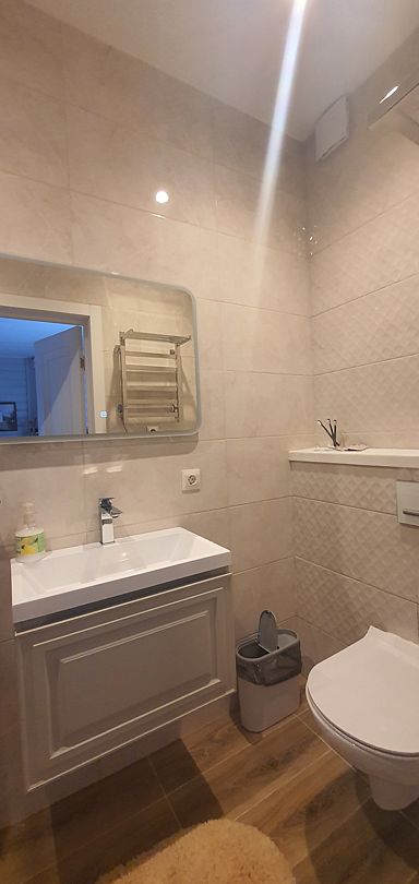 Душевая и санузел. Зеркало, полотенцесушитель, туалетные принадлежности.