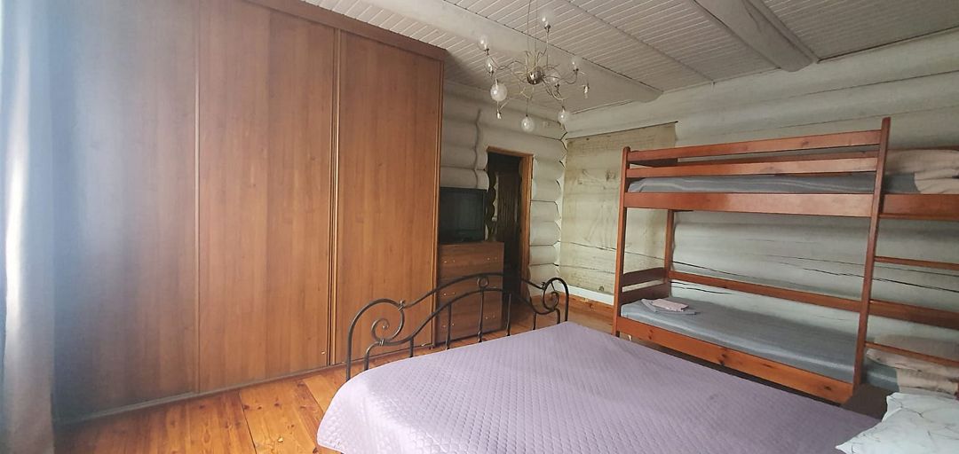 В доме комната с двухэтажной кроватью и большой двуспальной кроватью, в комнате большой шкаф-купе для одежды, комод и телевизор.