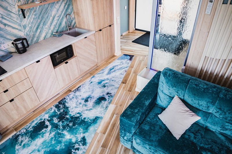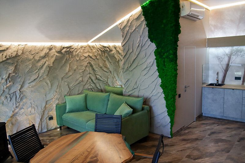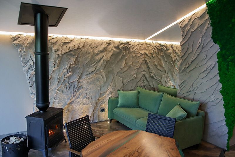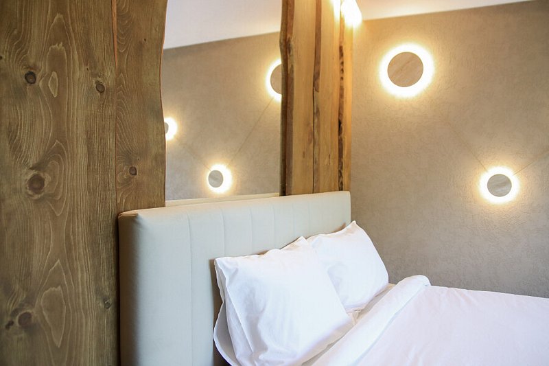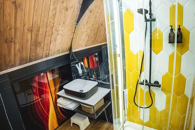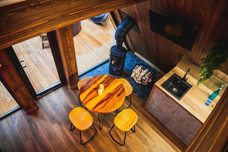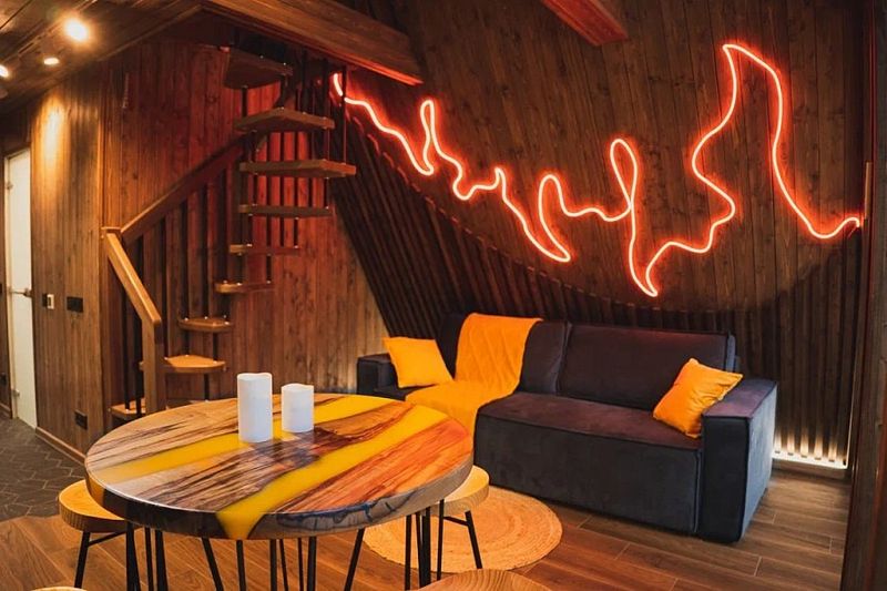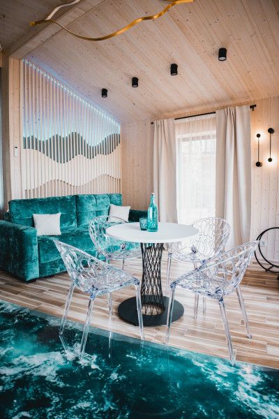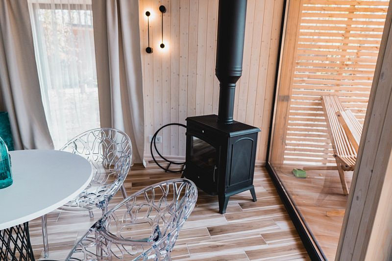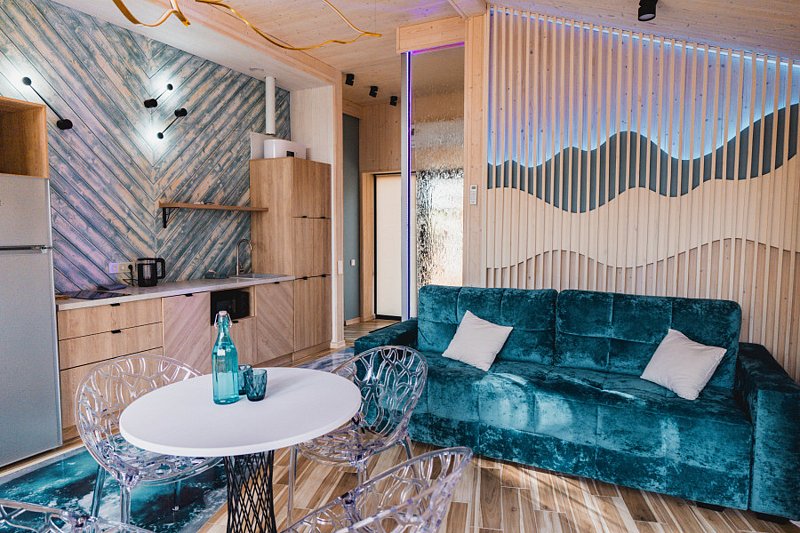 Дизайнерские решения каждого дома отражают характерные элементы Стихии, создавая неповторимый антураж. Уютные кровати с ортопедическими матрасами и белоснежным постельным бельем обеспечивают комфортный сон на природе. Обустроенная ванная комната сохраняет привычный комфорт во время отдыха. Для связи с миром и развлечений имеется телевизор и Wi-Fi. А камин создаст уютную атмосферу прохладными вечерами.