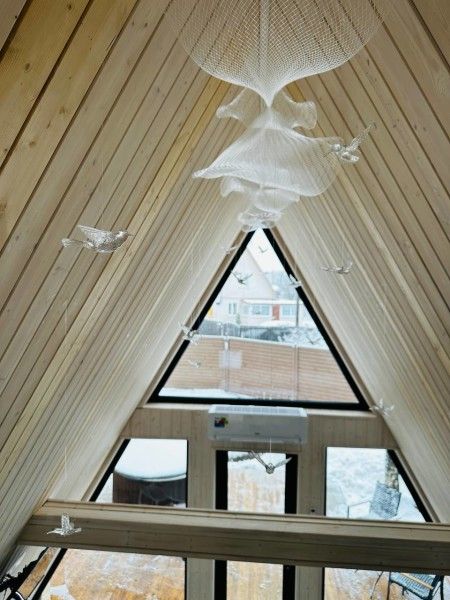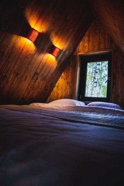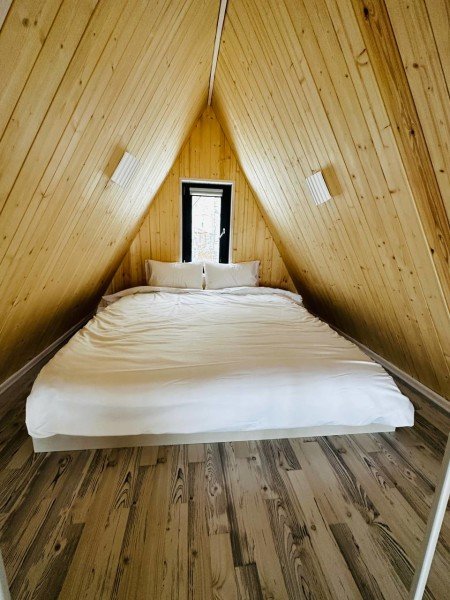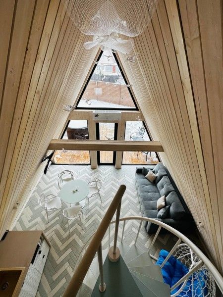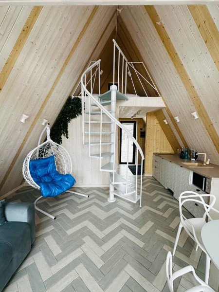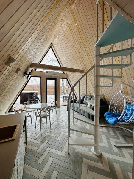 Двухэтажный дом A-Frame с лестницей вверх, где спальня становится вашим уютным облаком. Встречайте вместе рассветы: через панорамные окна весь дом освещают первые лучи солнца!