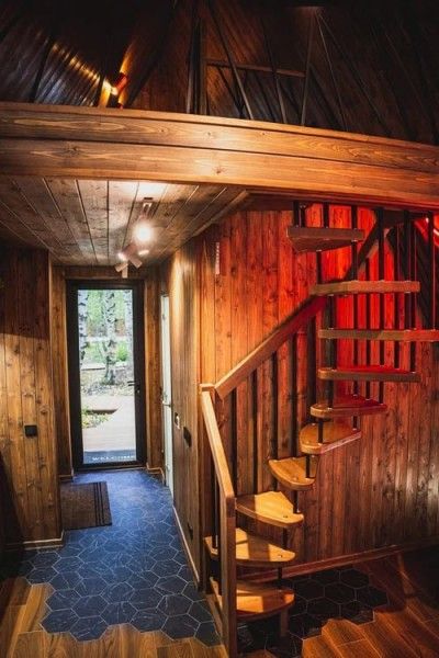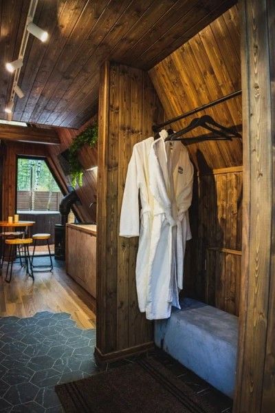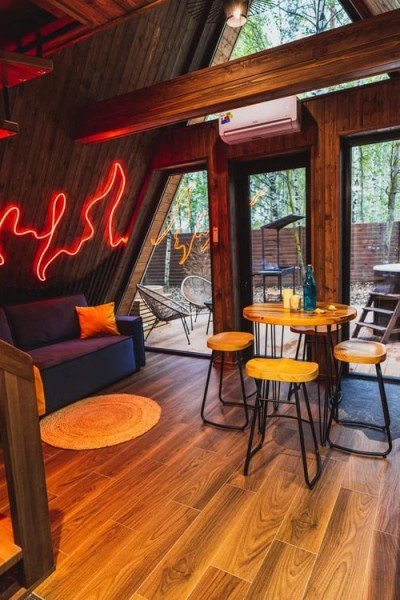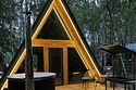 Дом A-Frame, на первом этаже расположены кухня и гостиная, на втором — спальня. Для влюбленной пары, желающей провести выходные только вдвоем, погреться в спа-купели с видом на звезды.