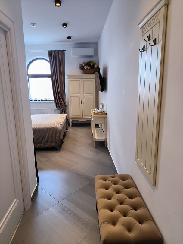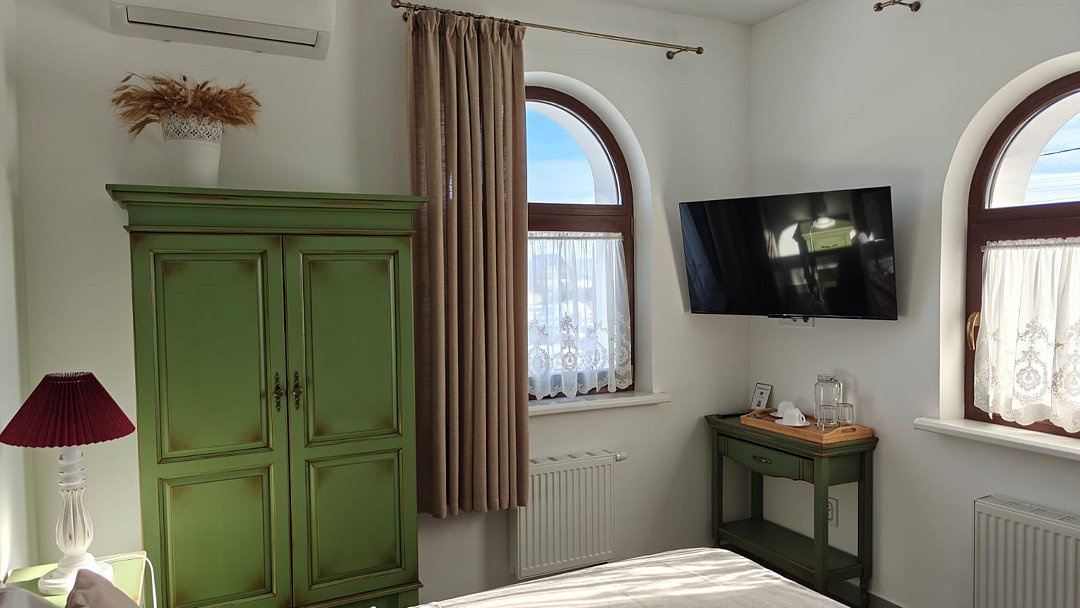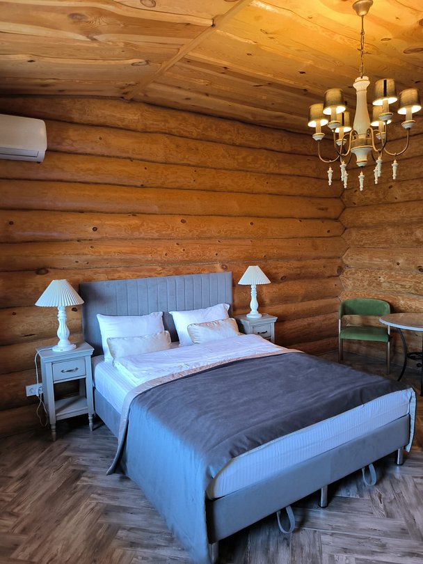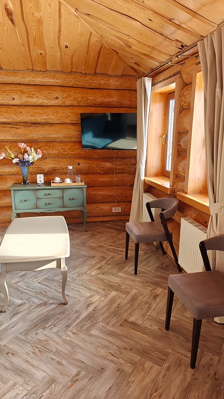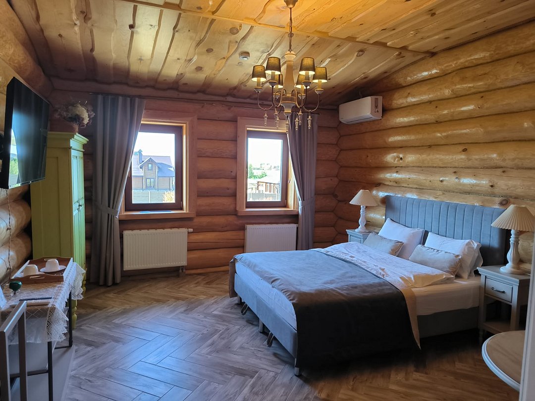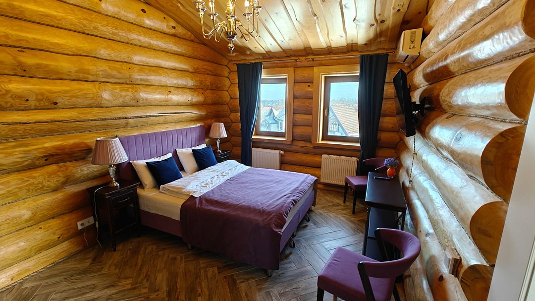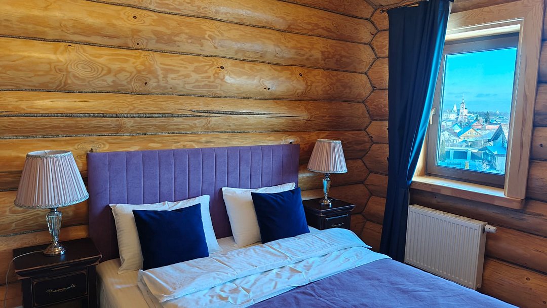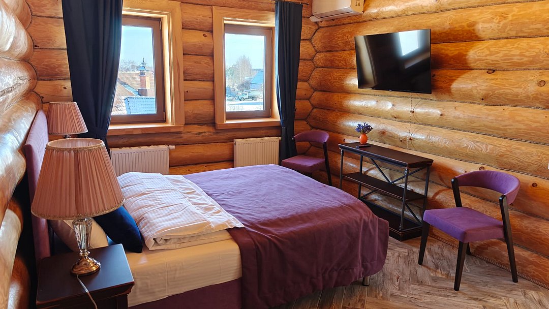 Номер люкс расположен на втором этаже в бревенчатой части гостевого дома. Вид из окна на город и на Суздальский Кремль великолепен. Номер состоит из двух комнат и просторной ванной комнаты. В спальной комнате есть двуспальная кровать 160х200, смарт-тв, шкаф, два стула, консоль.