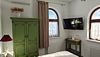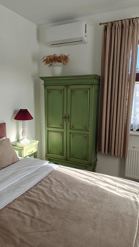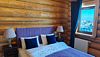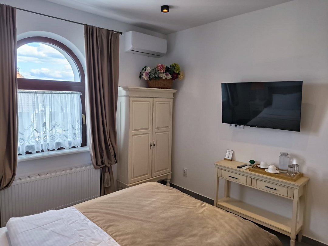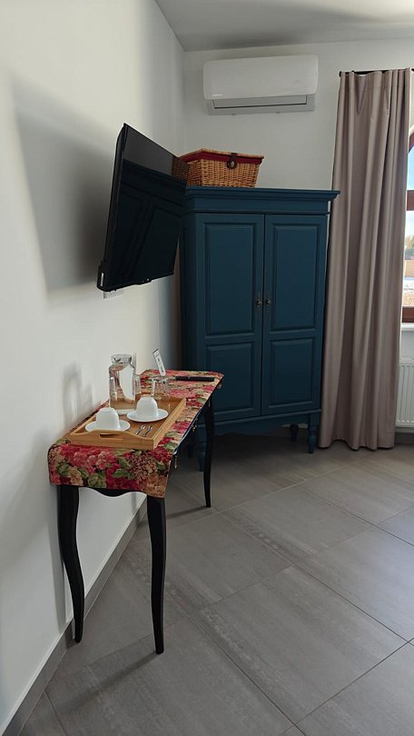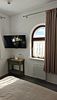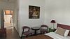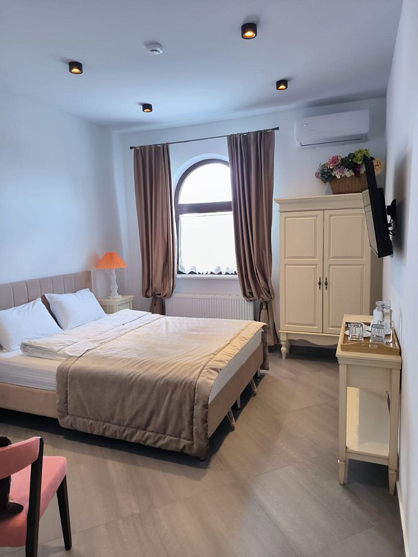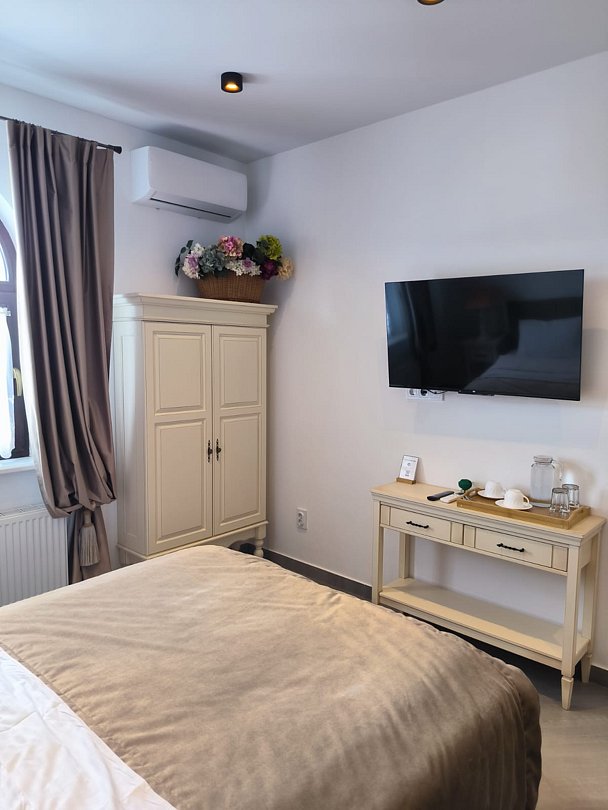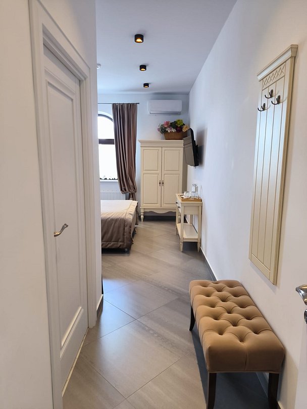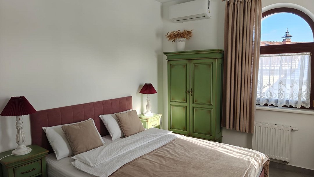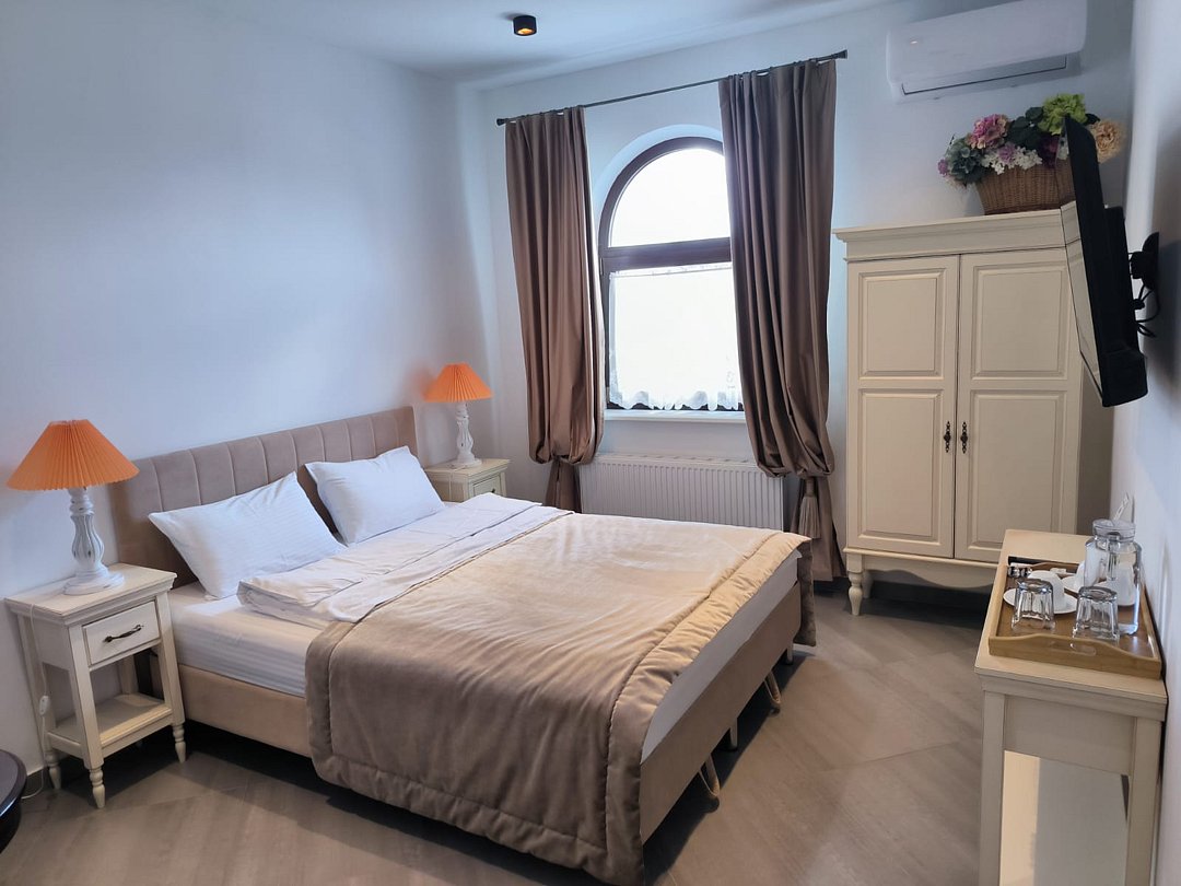 Номер люкс расположен на втором этаже в бревенчатой части гостевого дома. Вид из окна на город и на Суздальский Кремль великолепен. Номер состоит из двух комнат и просторной ванной комнаты. В спальной комнате есть двуспальная кровать 160х200, смарт-тв, шкаф, два стула, консоль.