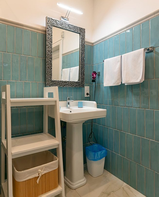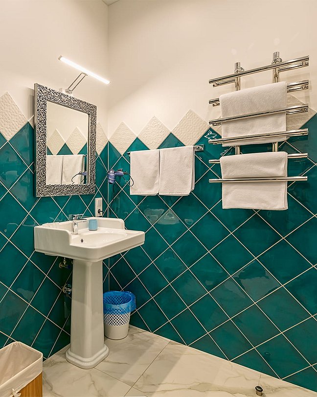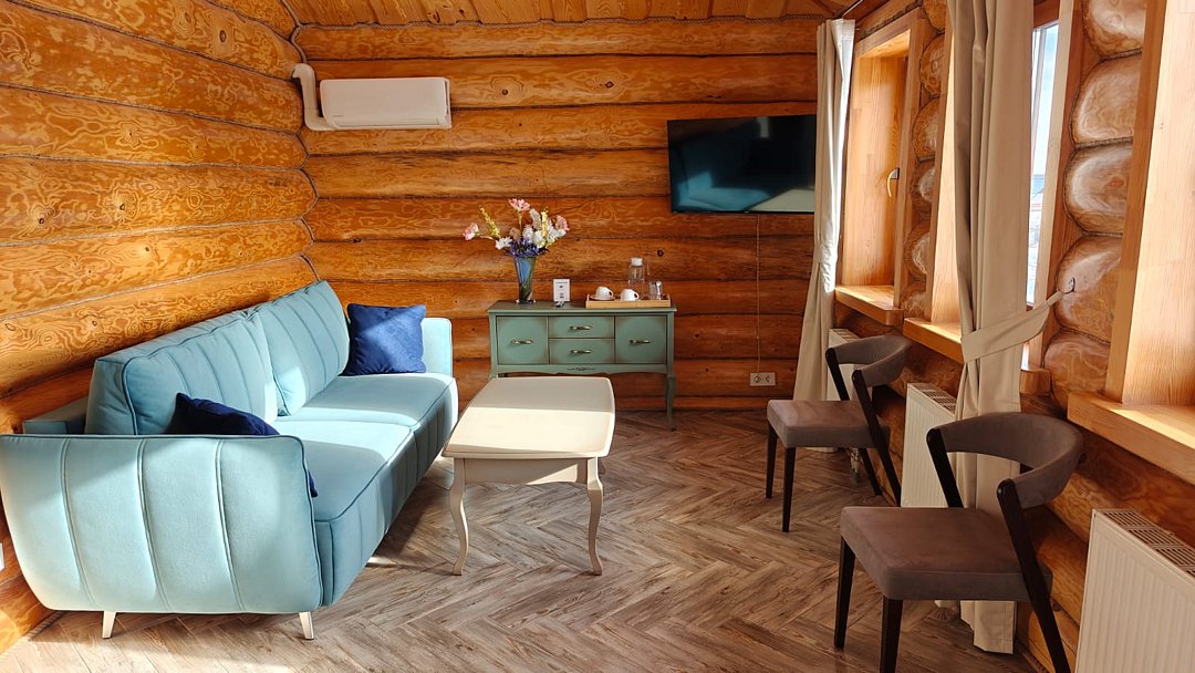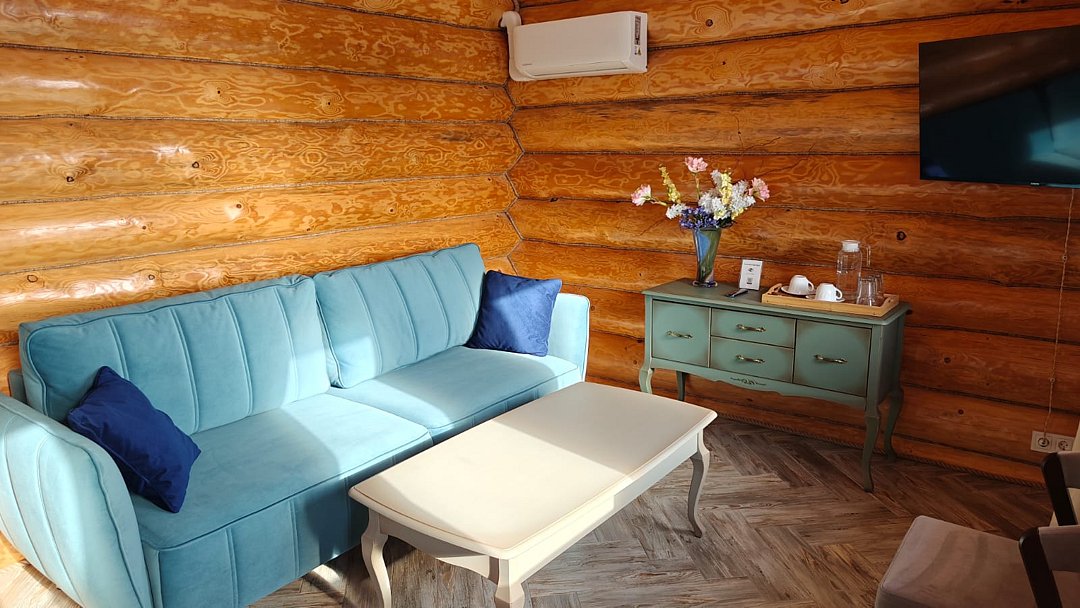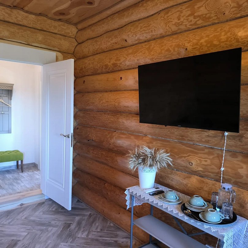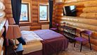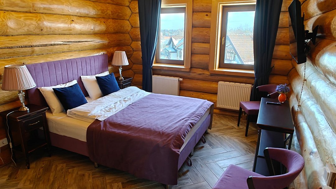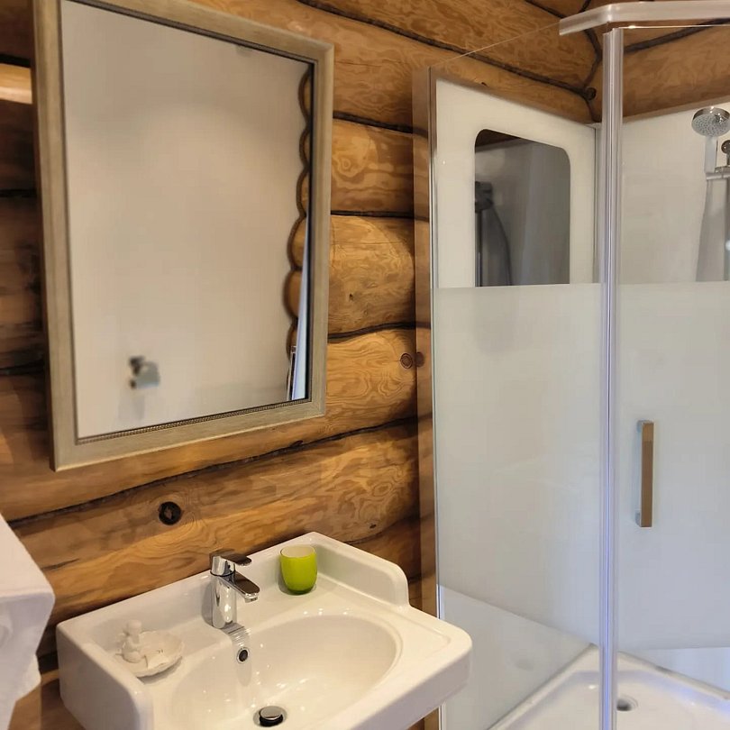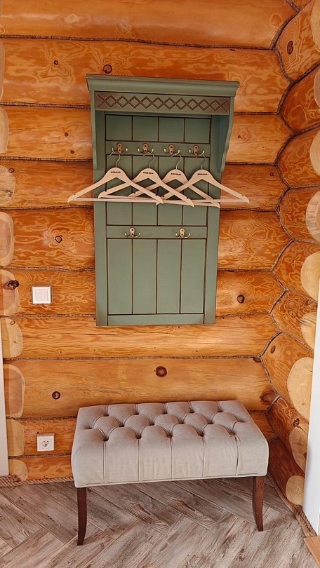 Номер расположен на втором этаже гостевого дома в бревенчатой части. В номере есть своя прихожая с вешалкой и удобной банкеткой. В ванной комнате есть душевая кабина 100х100, этажерка, фен, туалетные принадлежности, полотенца для душа и рук. Большое зеркало, удобная раковина.