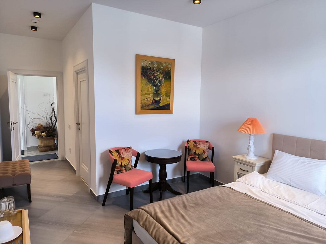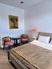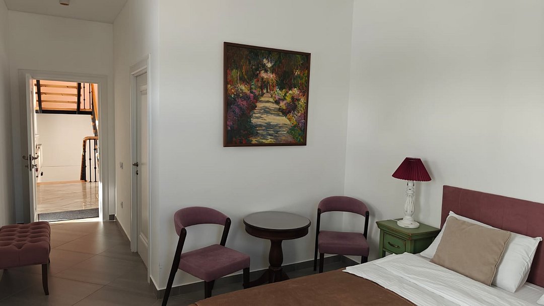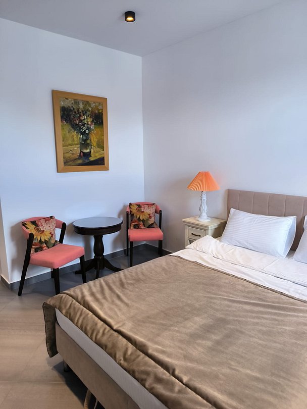 Просторная светлая комната оборудована кроватью queen-size, удобными новыми матрасами, тумбочками со светильниками с каждой стороны кровати и розетками для подключения телефонов, кофейным столиком и двумя стульями, шкафом, телевизором с IPTV 4K, высокоскоростным оптоволокном интернет.