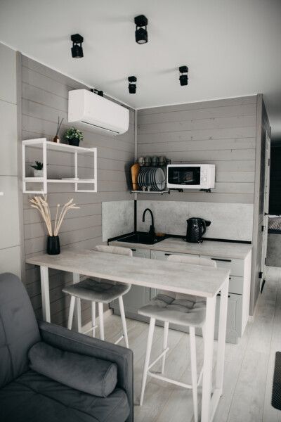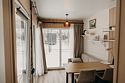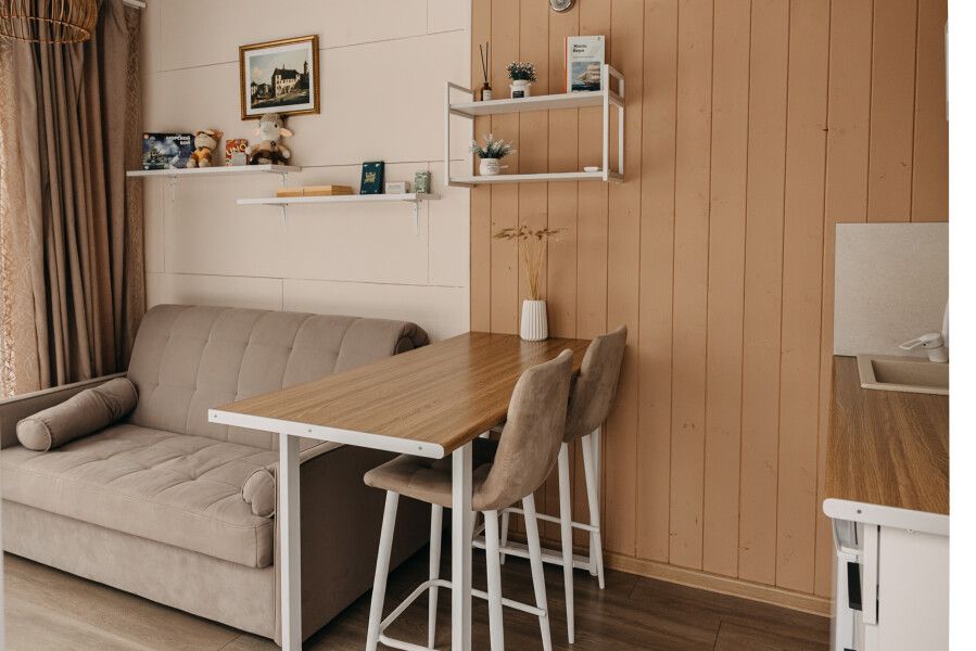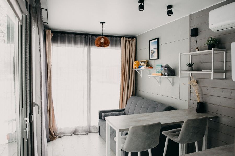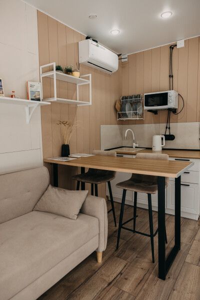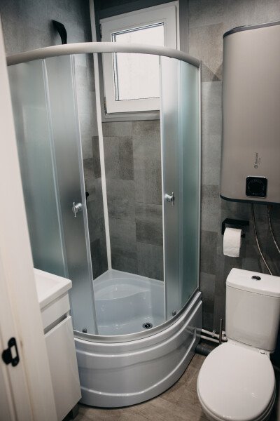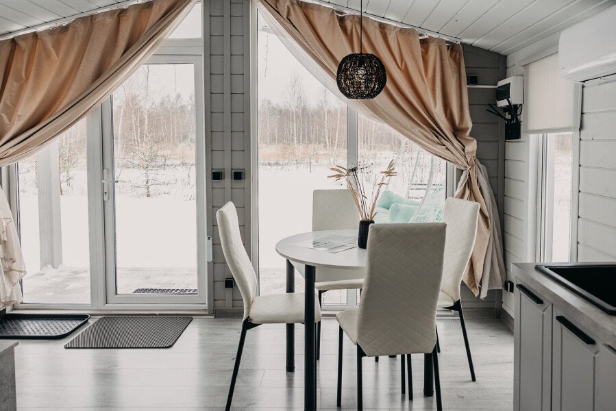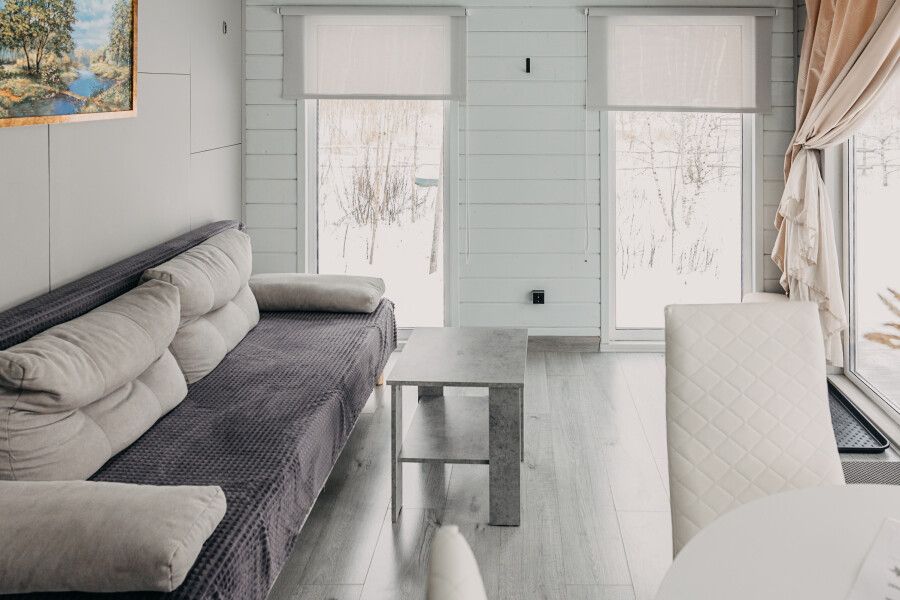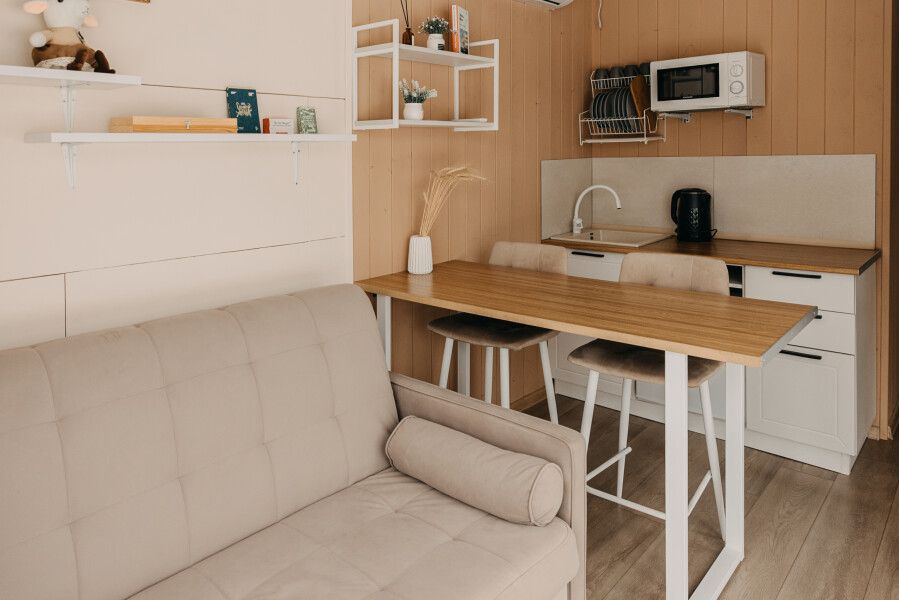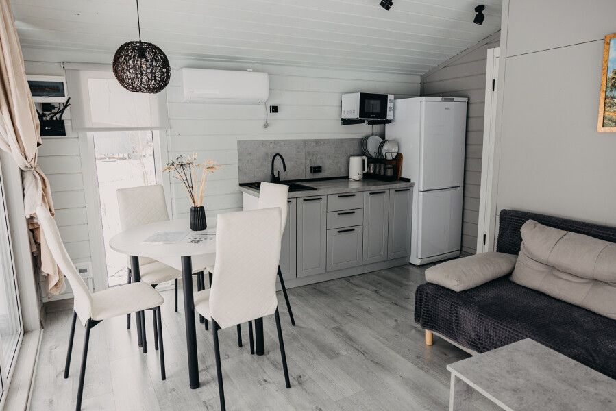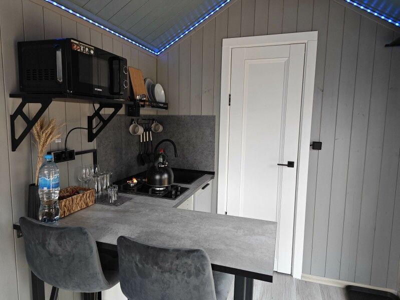 В домике есть всё необходимое для проживания: двуспальная кровать, двуспальный диван, мини-кухня с посудой, плитой, кухонной утварью, холодильником, микроволновкой, чайным набором.