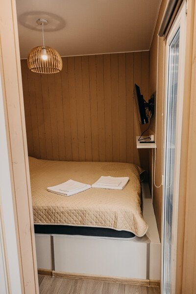 В домике есть всё необходимое для проживания: двуспальная кровать, мини-кухня с посудой, плитой, кухонной утварью, холодильником, микроволновкой, чайным набором.