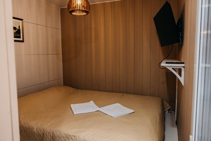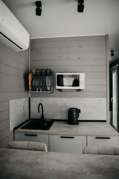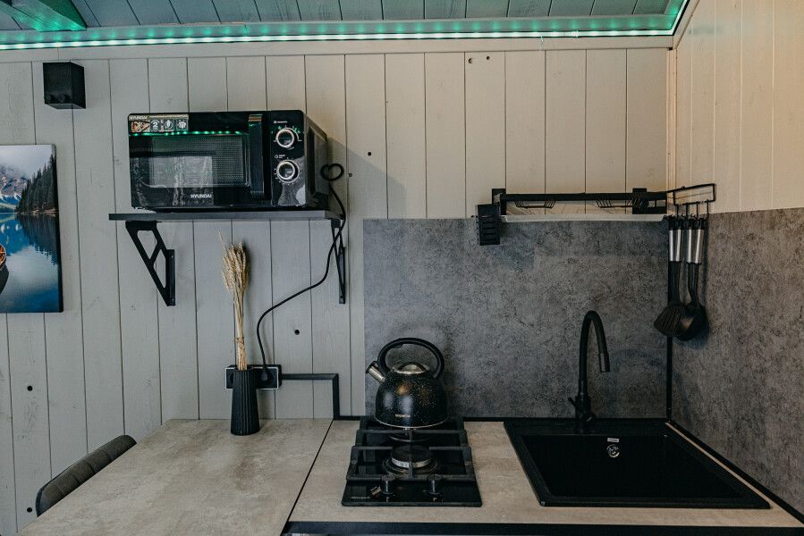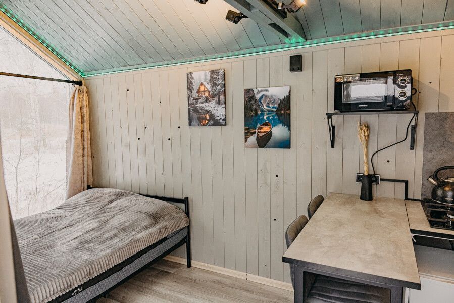 В домике есть всё необходимое для проживания - двуспальная кровать, мини кухня с посудой, плитой, кухонной утварью, холодильником, микроволновкой, чайным набором.