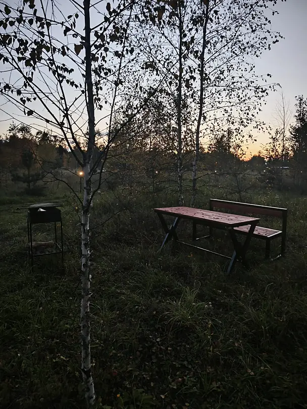 У каждого домика есть отдельная зона барбекю — стол, лавка, хороший мангал, кочерга. Шампуры, уголь, дрова, розжиг можно приобрести в глэмпинге.