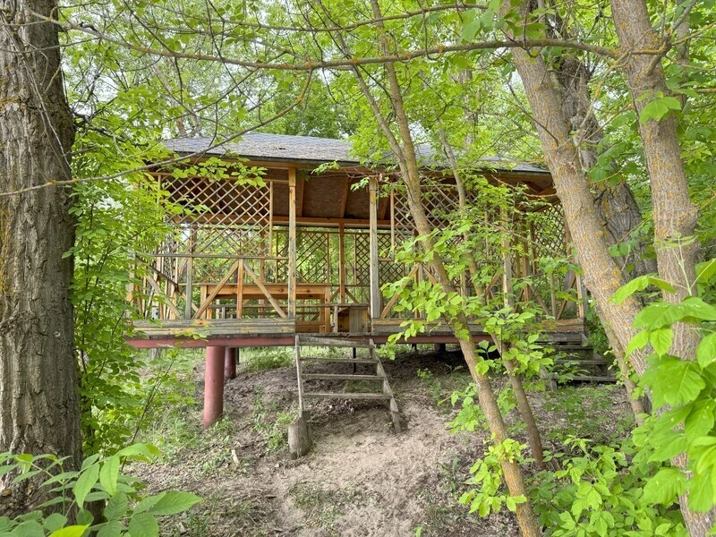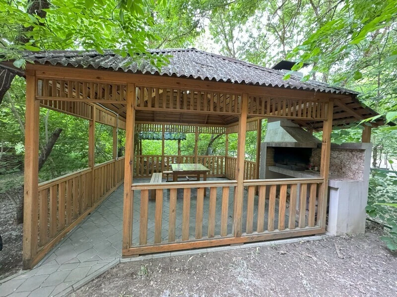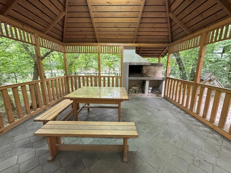 На берегу находится просторная крытая беседка