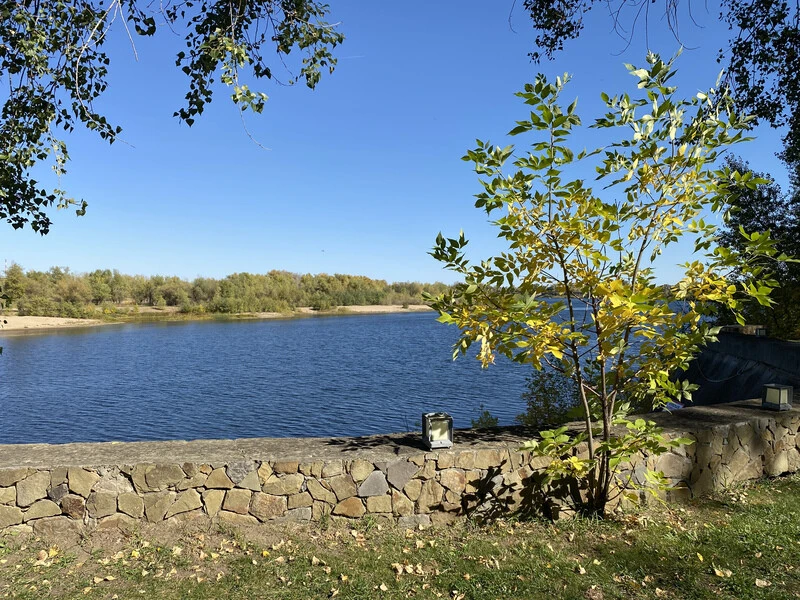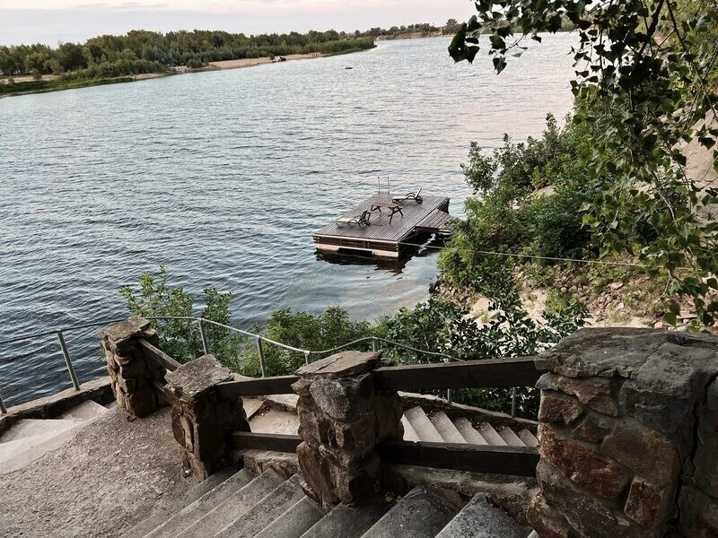 Спуск к воде оборудован бетонными лестницами и укрепительными стенами. В летний сезон с понтона допустимо купаться, с соблюдением правил безопасности. Понтон оборудован шезлонгами для отдыха, а так же столиком с лавками. С понтона в весенне–осенние сезоны вполне можно выудить хорошие экземпляры рыбы.