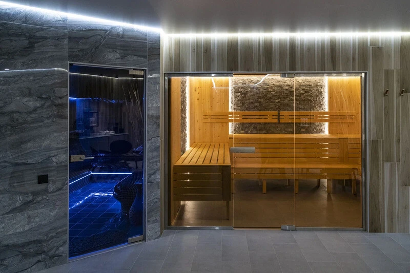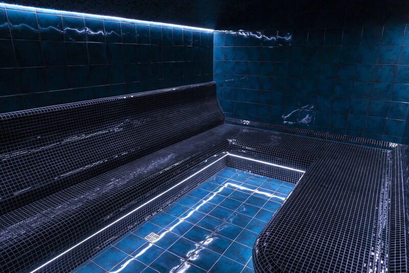 Комплекс вмещает от 2–х до 12 человек. Минимальный заказ: 2 часа. Состав: финская сауна, хаммам, мокрая зона отдыха, обеденный зал с зоной отдыха, 2 санузла, раздевалки, массажный кабинет, уличная чилл–зона с диваном. Бассейн — территория общего пользования. Включено в стоимость: простыни, чай, вода, посуда, микроволновка, акустическая система.