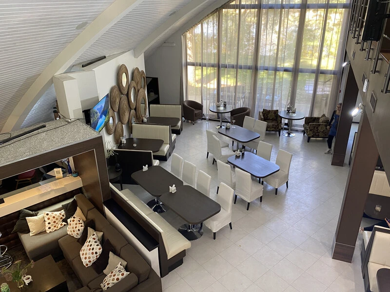 Ресторан состоит из основного зала для торжеств (трапезная зона, контактный бар, зона для выступления артистов с точкой подключения, санузел), внутренней лаундж–зоны на втором этаже, верхней уличной террасы, бэкярда для отдыха на улице и кальянов. С тремя выходами на улицу. Зал оборудован звуковым и световым оборудованием, двумя плазменными панелями, системой климат–контроля.