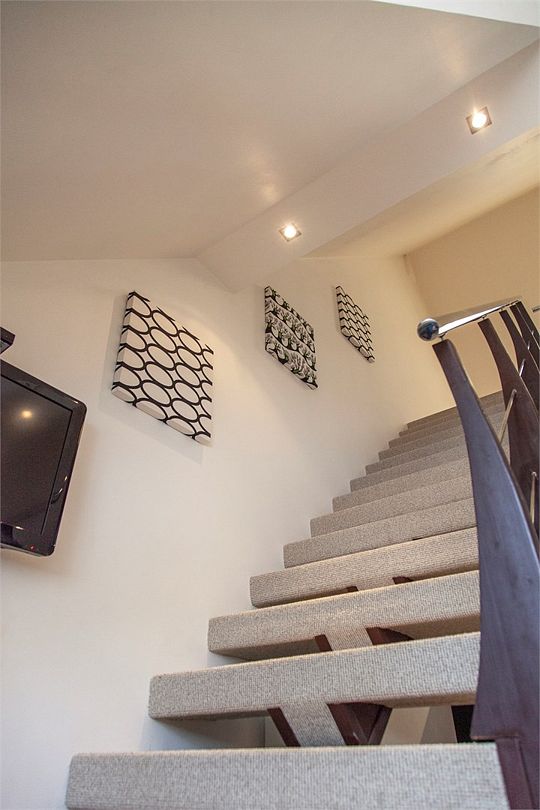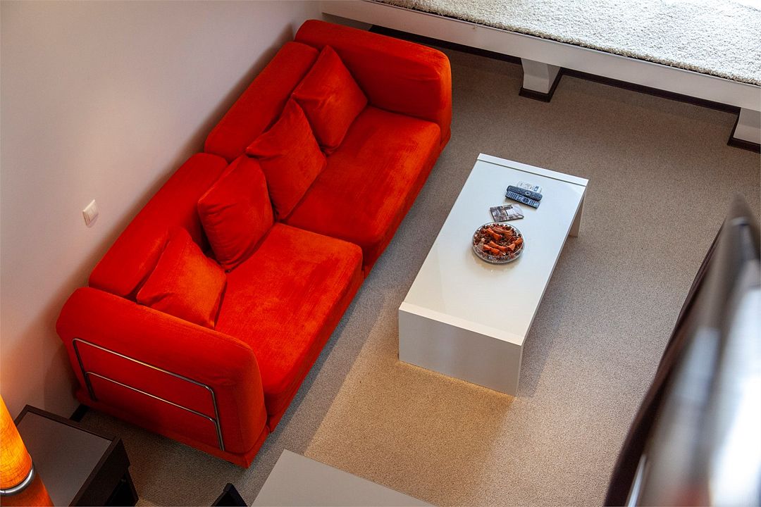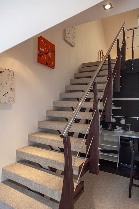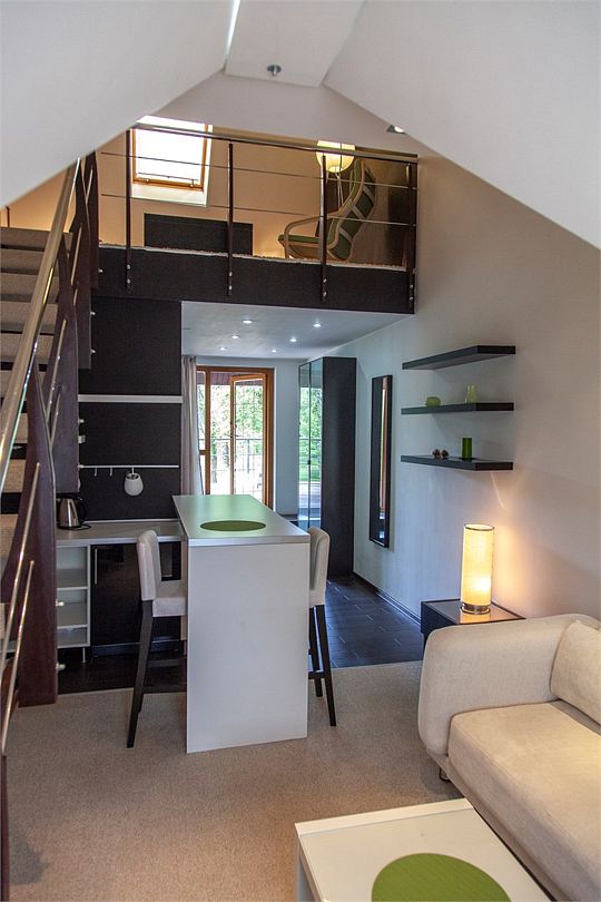 На нижнем этаже номера располагается прихожая, ванная комната, мини-кухня (посуда, стекло, приборы на 4 персоны), чайник, чайный набор, микроволновка, гостиная с диваном, телевизор.