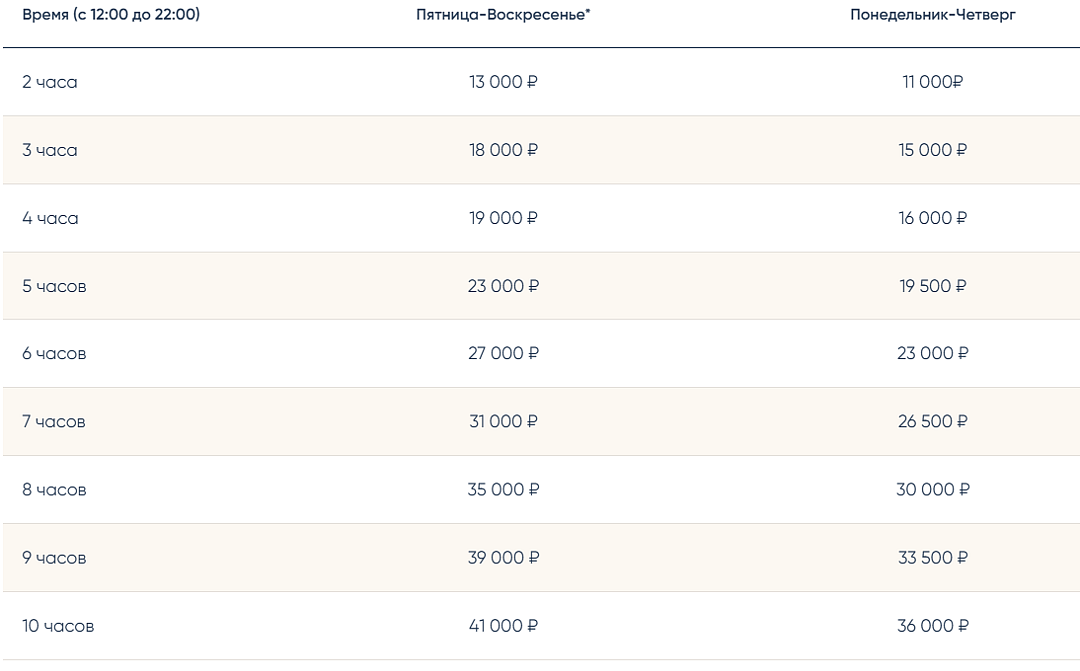- аренда ресторана (с 12:00 до 23:00) — 50000 ₽ (пн–чт), 60000 ₽ (пт–вс);