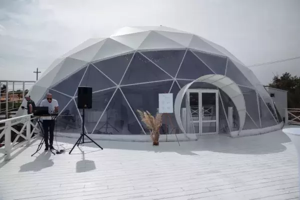Диаметр 20 м., площадь 314 кв.м., высота купола в высшей точке 8 м. Банкетная посадка 150 чел., театральная посадка 200 чел., фуршетная до 400. Всесезонный. Собственный санузел, сплит система тепло/холод, большое подсобное помещение с собственным санузлом, возможность подключения электрики 380, парковка, выгрузка-погрузка у подсобного помещения. Подходит для свадеб, корпоративов, конференций, фестивалей, шоу, дней рождений.