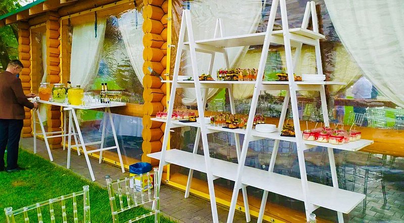 - 10 000 ₽/час по времени аренды шатра. Площадка терраса и газон. Обязательно к оплате, в случае фуршета на улице и выездной регистрации при расстановке мебели и оборудования. + доп.мебель д/регистрации. Мебель из шатра НЕ ВЫНОСИТСЯ!