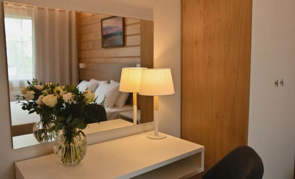 Расположен на втором этаже нового гостиничного комплекса с видом на живописное озеро.