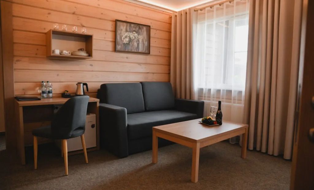Уютный номер с двуспальной кроватью и диваном.