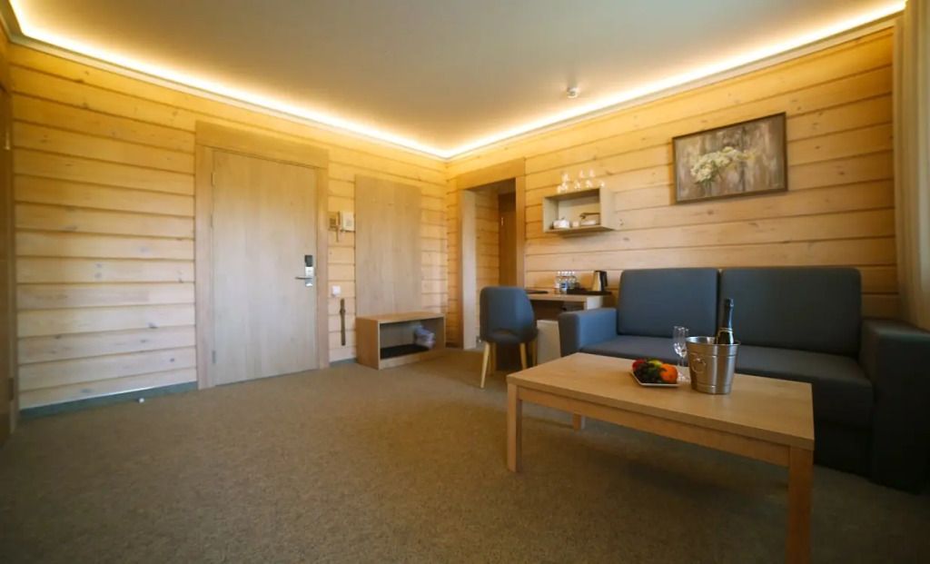На ухоженной территории с живописным озером вы также найдёте СПА-центр, летний и крытый аквапарк, ресторан грузинской кухни «Мимино», ресторан шведской линии «Аэропорт» и бар «Самолет». Доступны услуги рыбалки, вейкборд, прогулки на яхте, лодках или катамаранах.