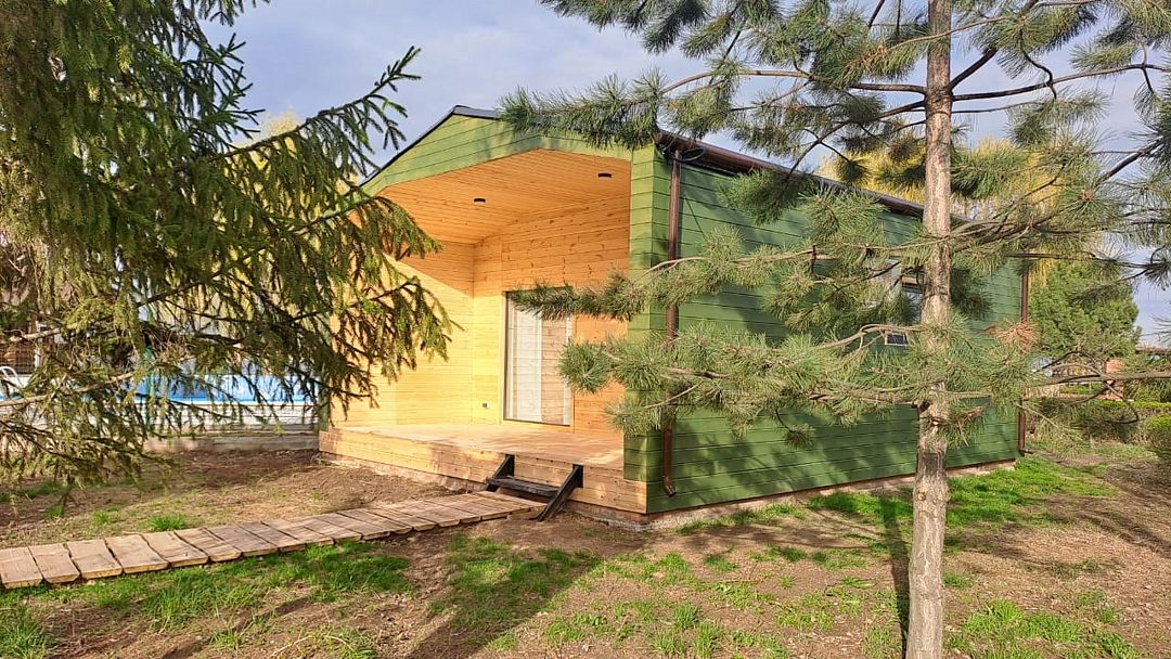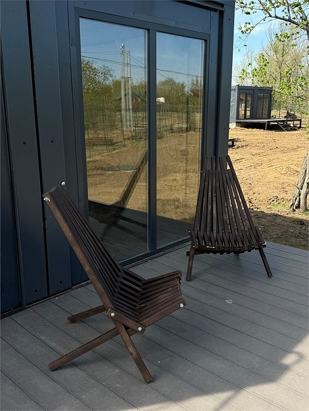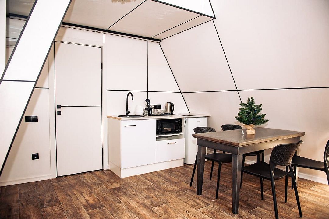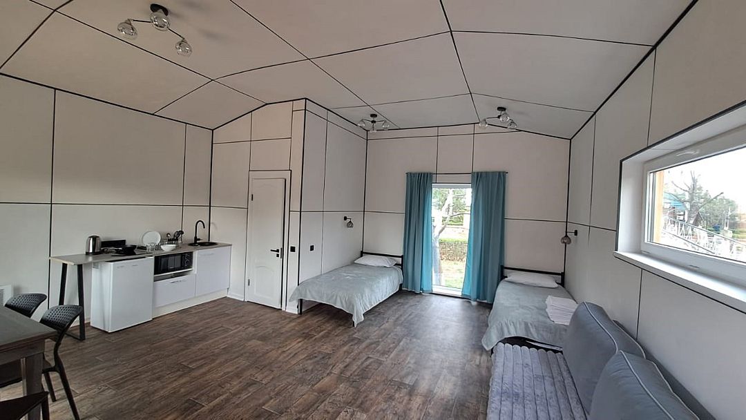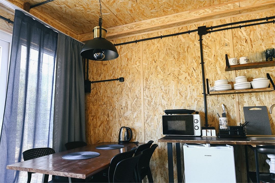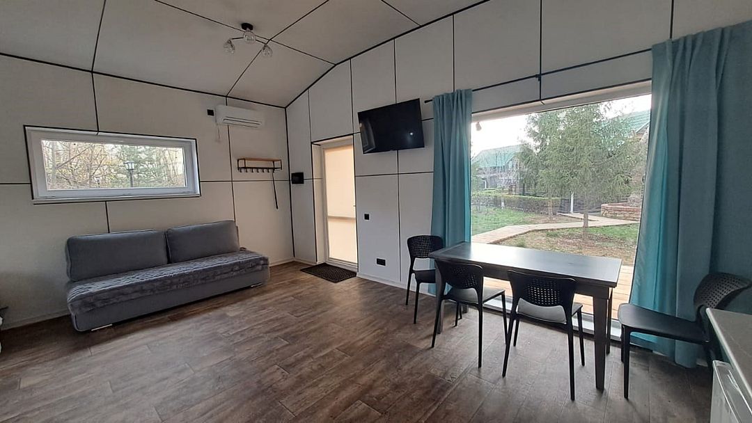 Модульный дом с уютной террасой, панорамными окнами. Каждый номер оснащен всем необходимым для комфортного проживания.