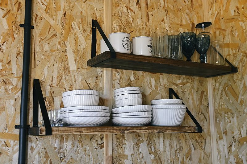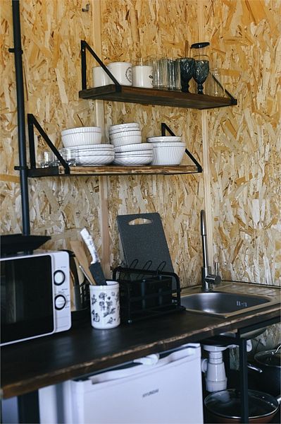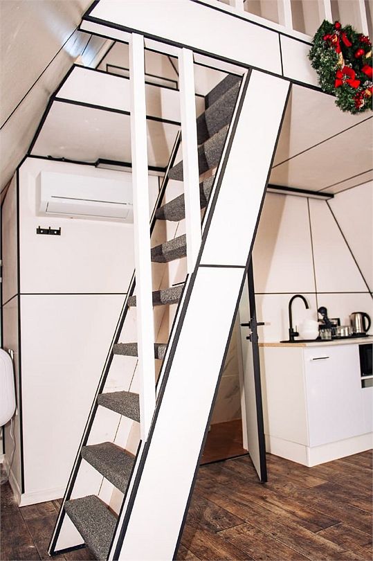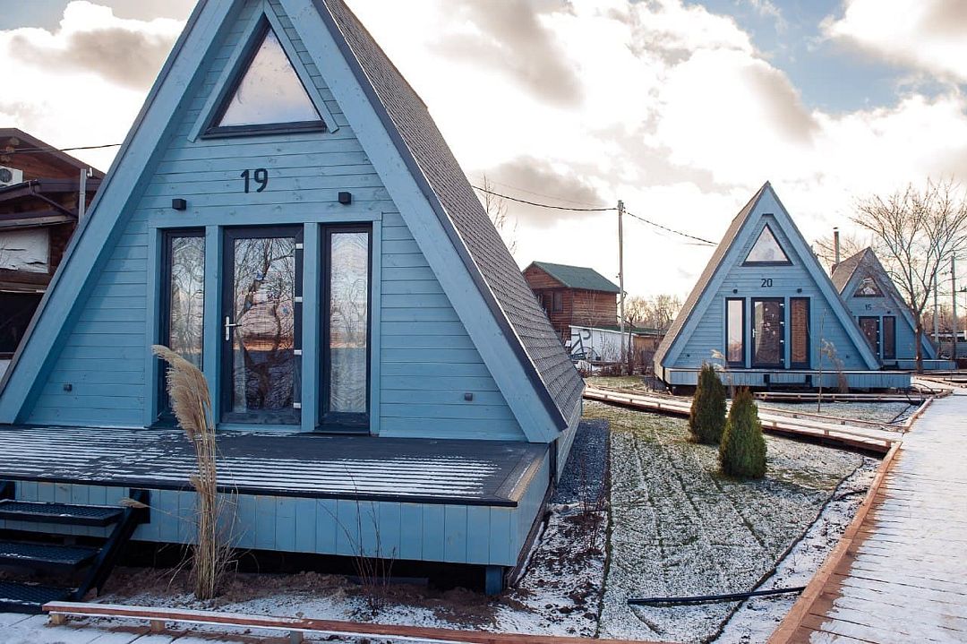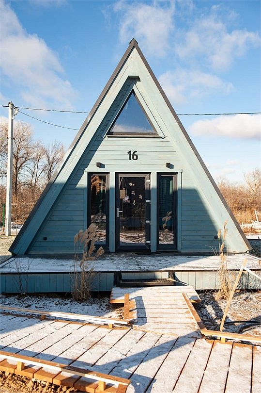 Дом в треугольном стиле под названием A-frame. Первый уровень — кухонная зона со всем необходимым для приготовления пищи, гостиная, ванная комната.