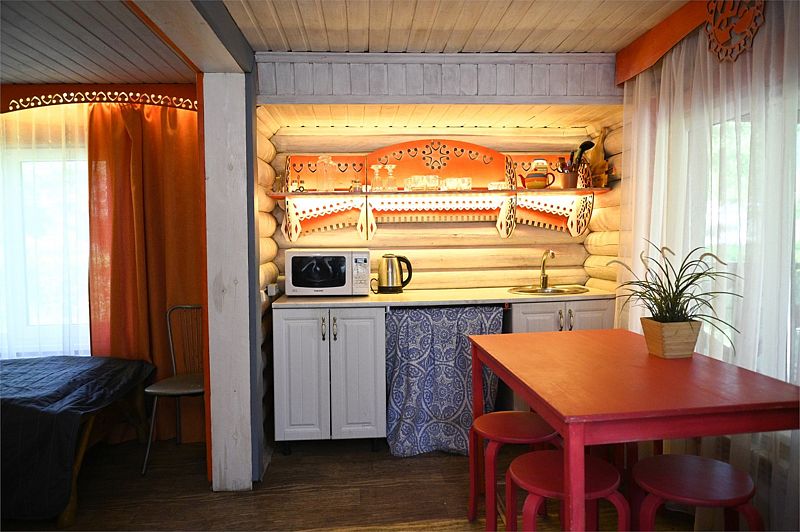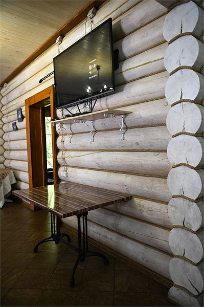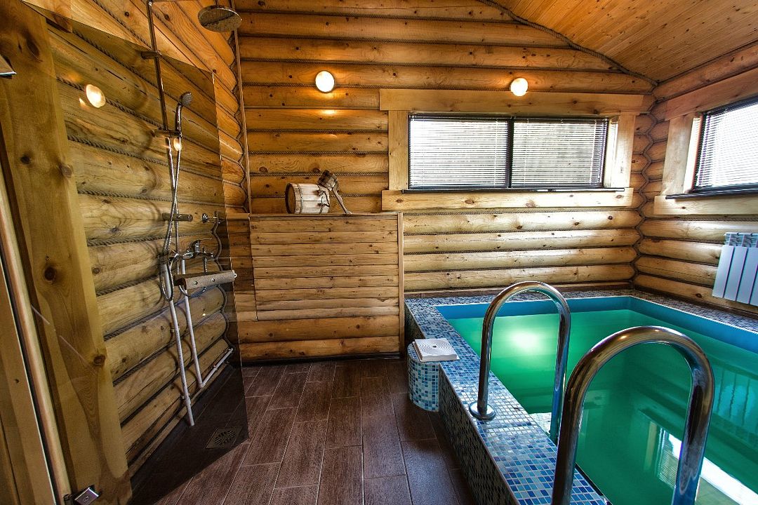 Баня на дровах — это место, где можно насладиться теплом и запахом дерева. Здесь есть бассейн, где можно освежиться после парной. Для комфортного отдыха предусмотрены гостиная с кухней, комната для отдыха с телевизором и все необходимые удобства, включая душ, санузел и современную бытовую технику.