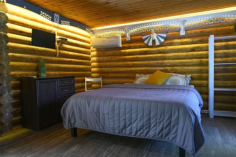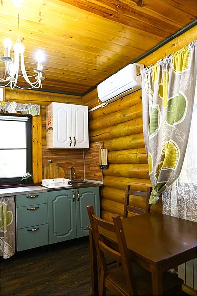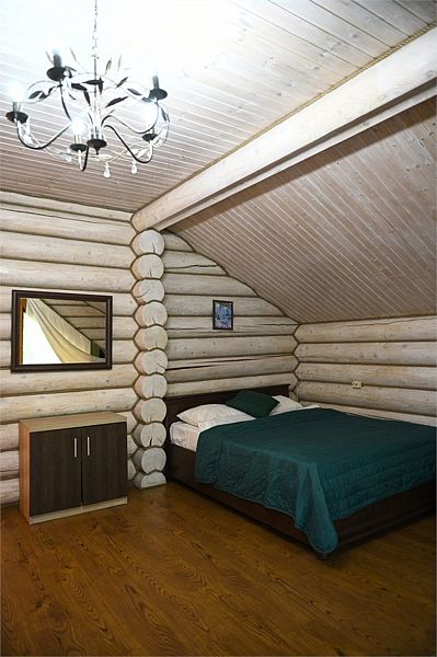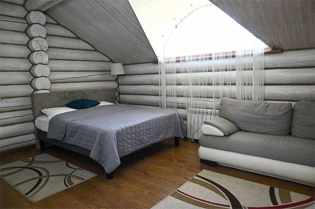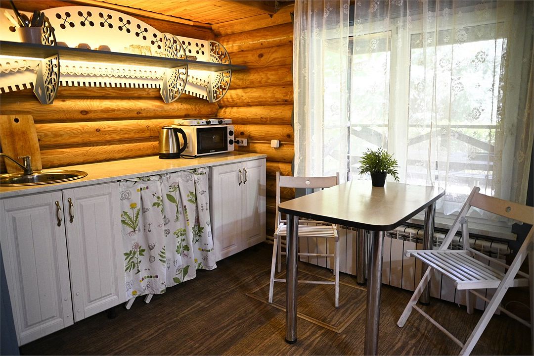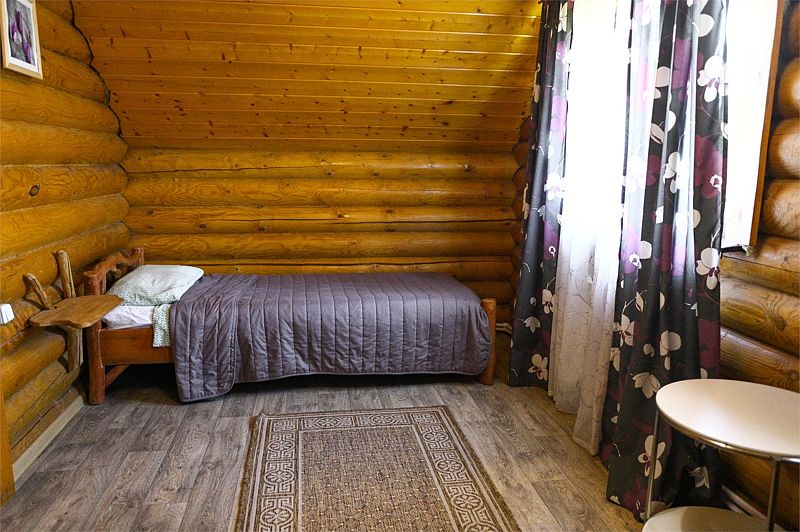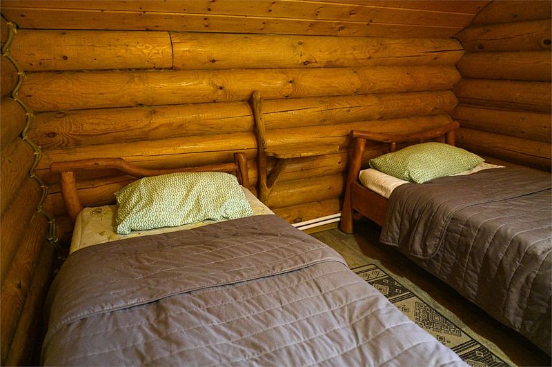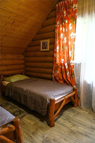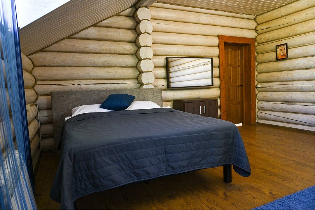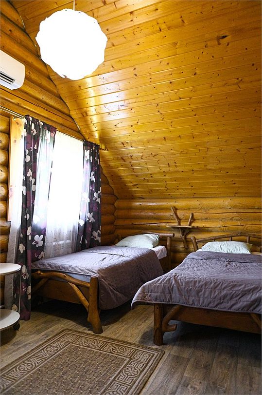 Двухэтажный сруб с одной спальной зоной на первом этаже и двумя спальными зонами на втором этаже. Кухонная зона на первом этаже со всем необходимым для приготовления пищи, террасой перед срубом.