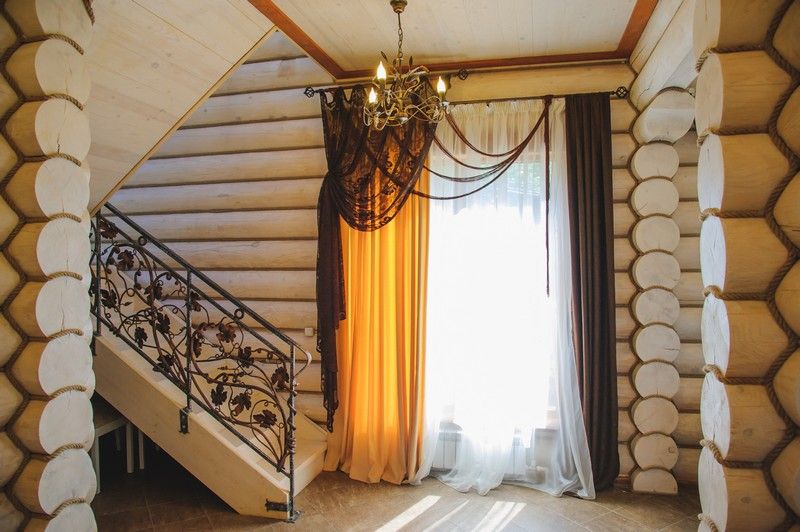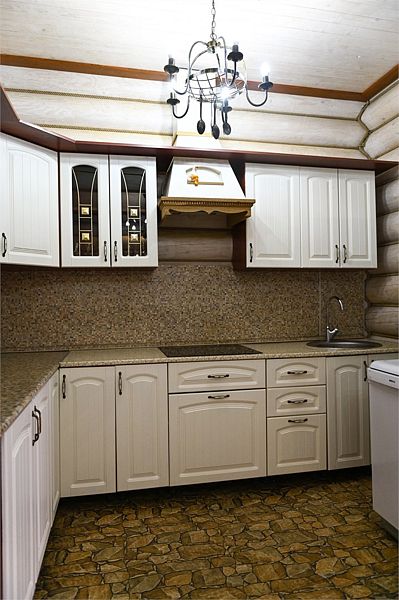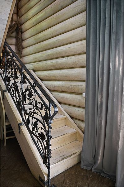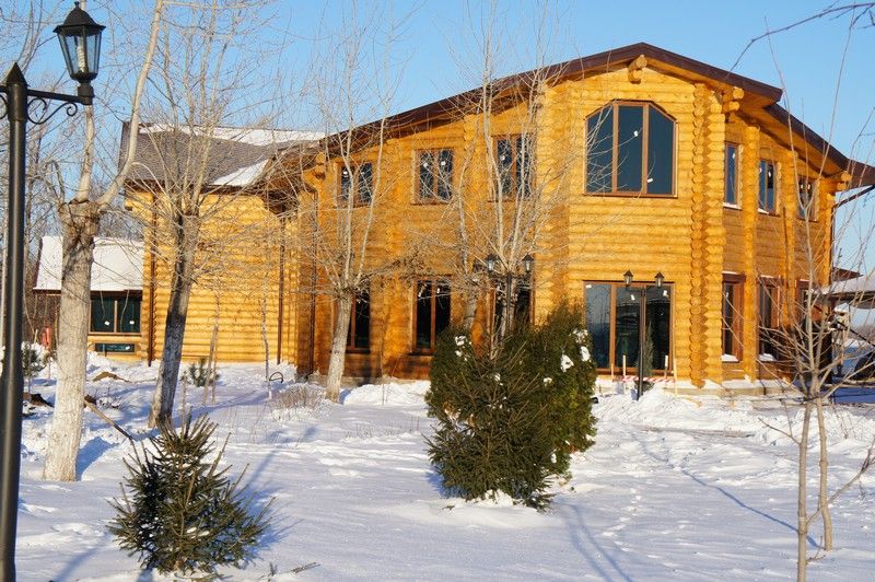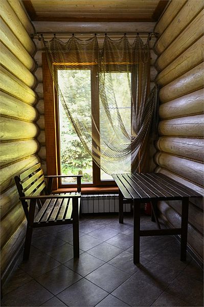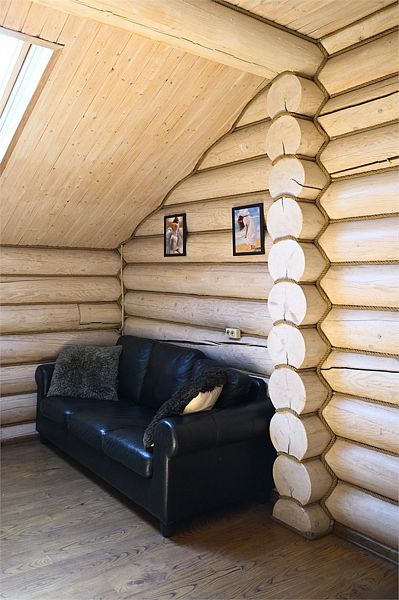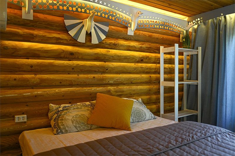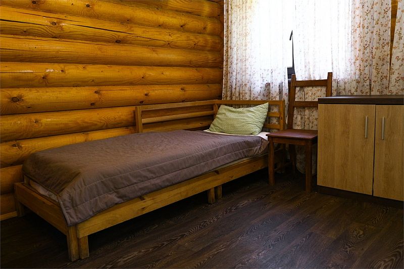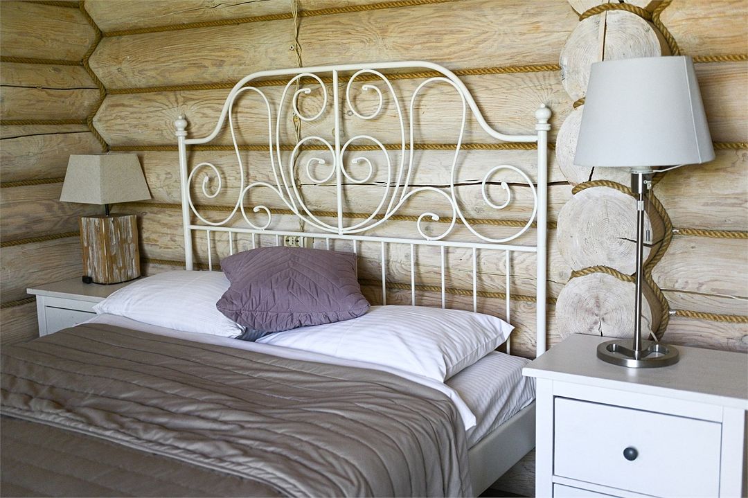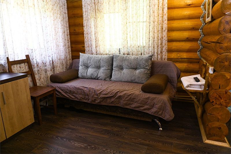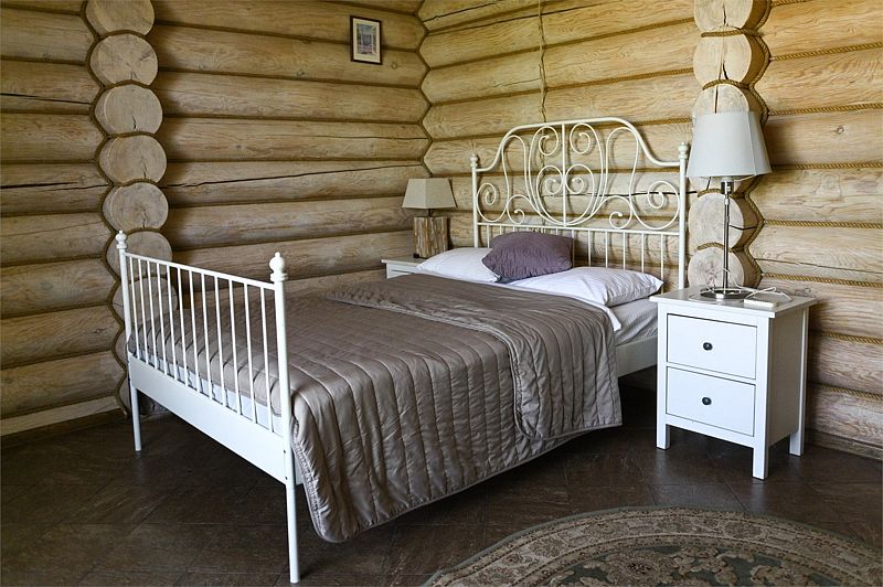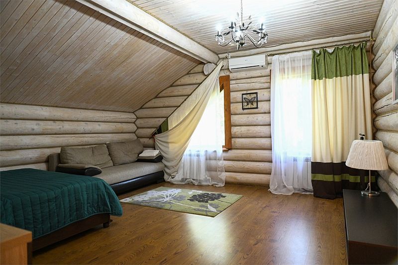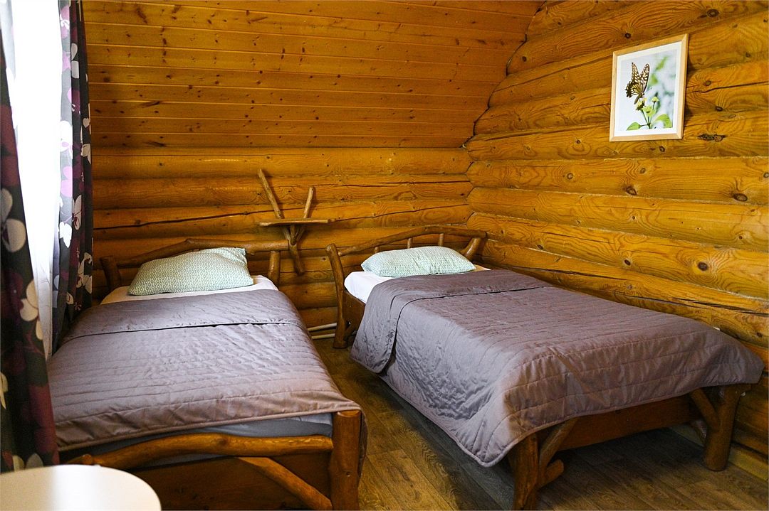 Двухэтажный сруб с одной спальной зоной на первом этаже и двумя спальными зонами на втором этаже. Кухонная зона на первом этаже со всем необходимым для приготовления пищи, террасой перед срубом.