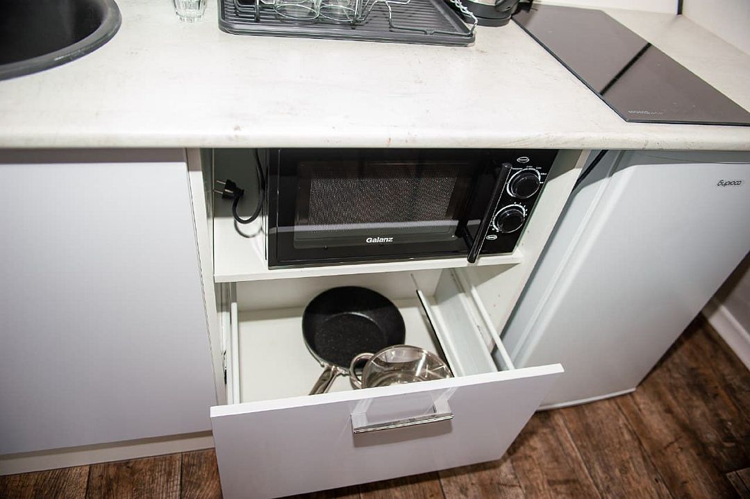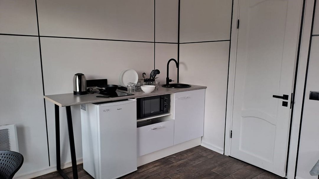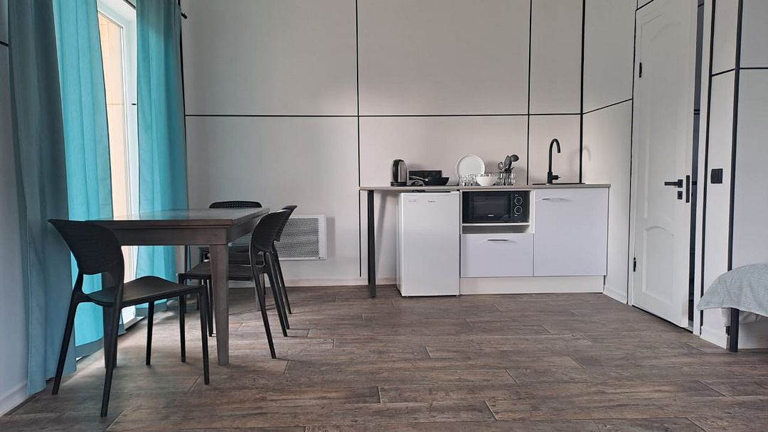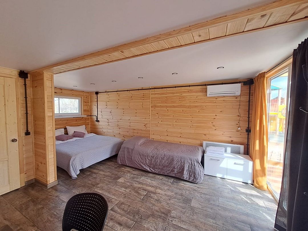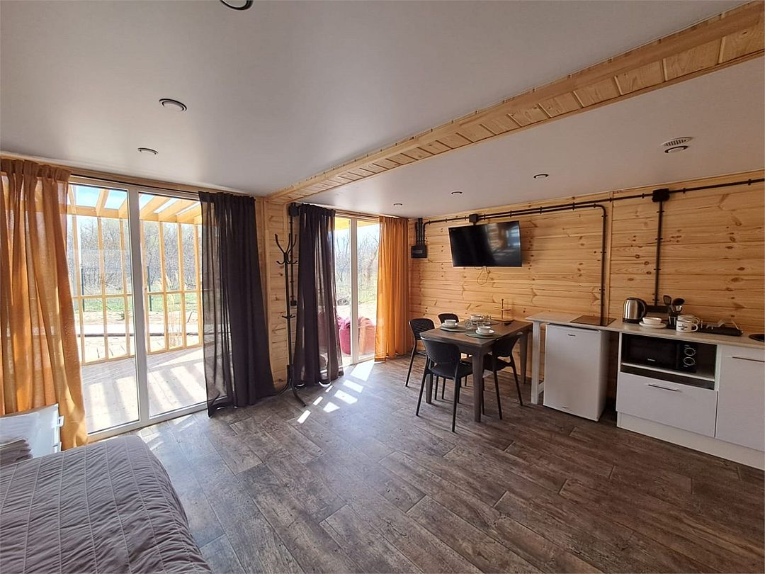 Просторный дом с размещением до четырех человек. Номер-студия, кухонная зона со всем необходимым для приготовления пищи, гостиная, ванная комната, спальная зона.