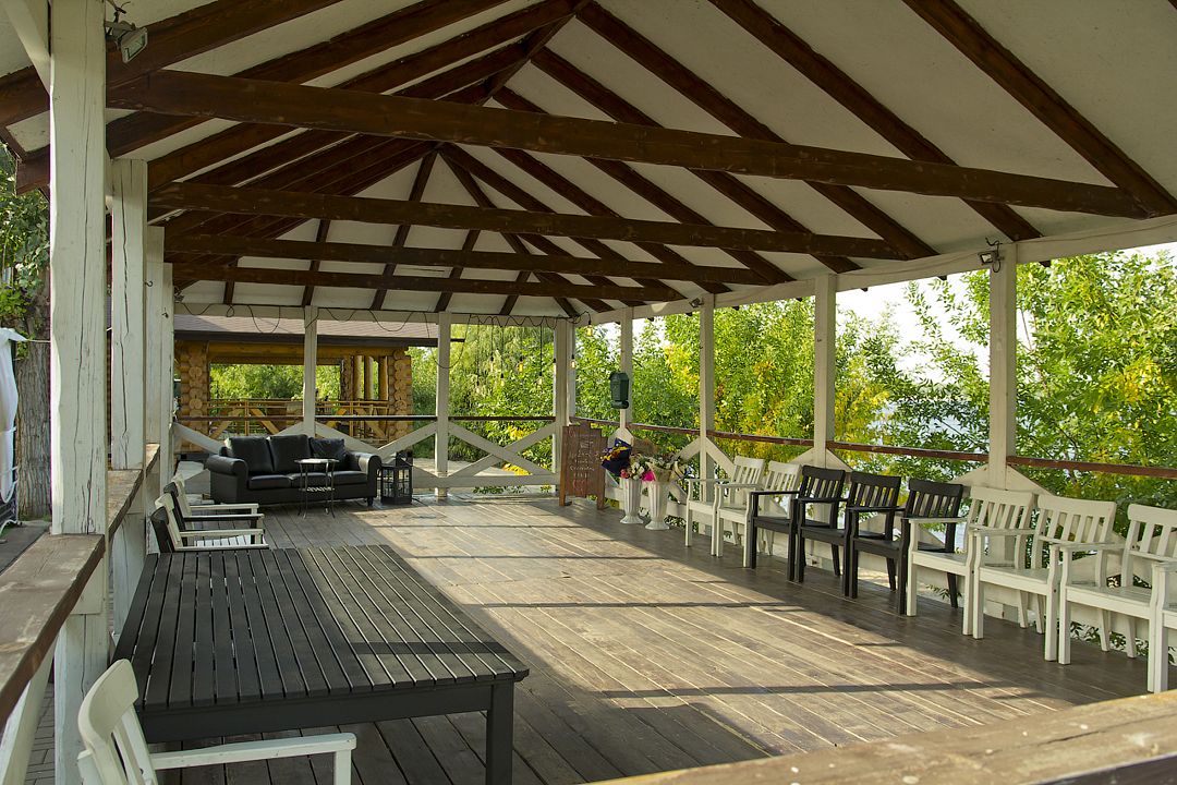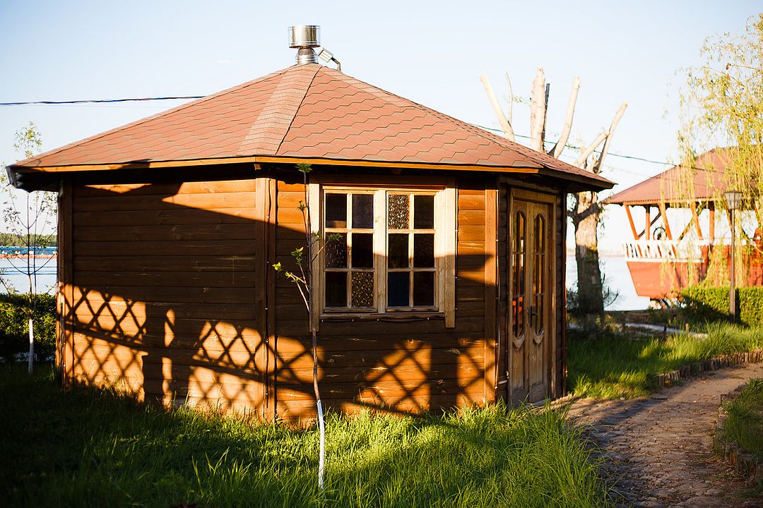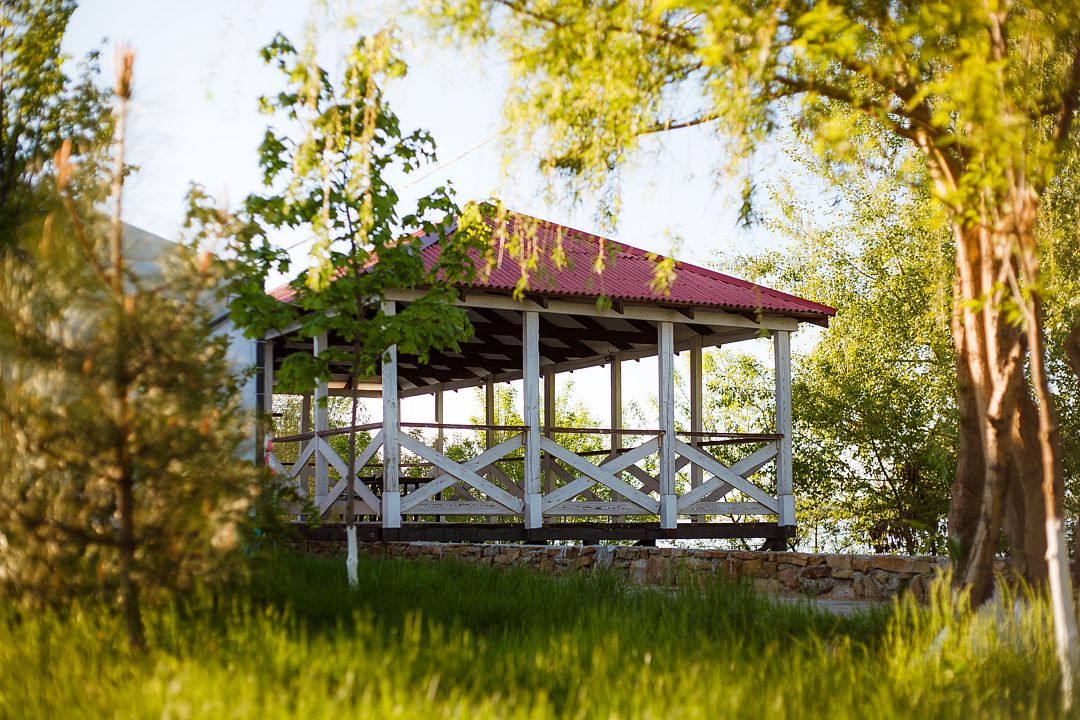 Беседка «Сказка» с панорамными окнами, которая вмещает до тридцати человек — идеальное пространство для организации мероприятий с живописным видом на окружающую природу.