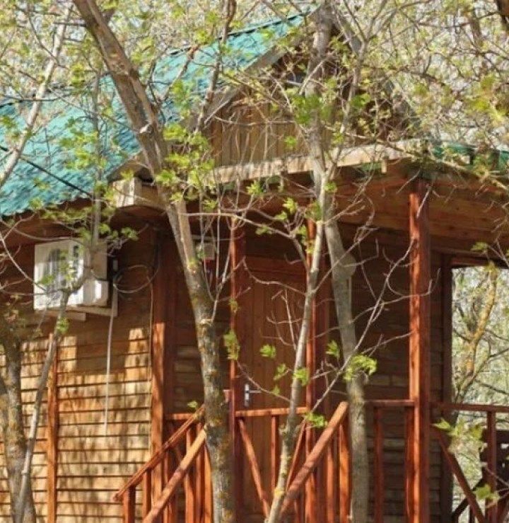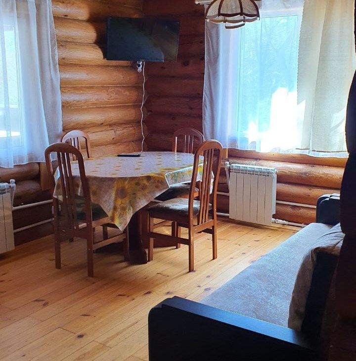 Отдельно стоящий коттедж-сруб с 2 комнатами (одна отдельная комната, кухня, совмещенная с комнатой и санузел). Возле коттеджа оборудован мангал. Парковка.