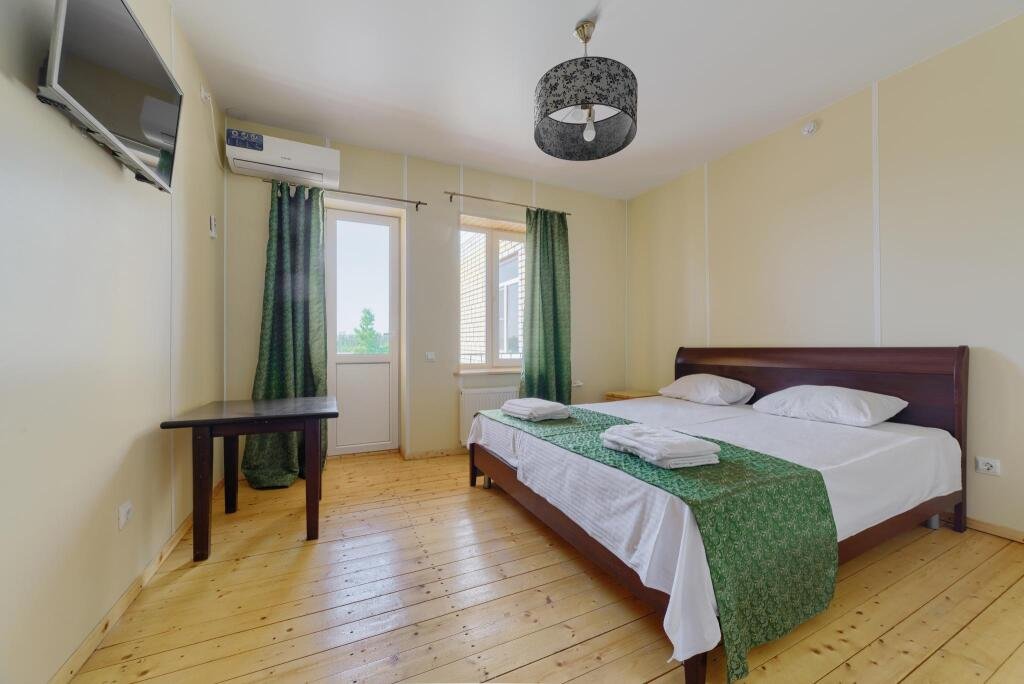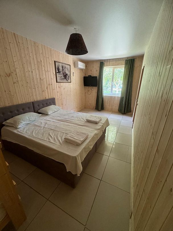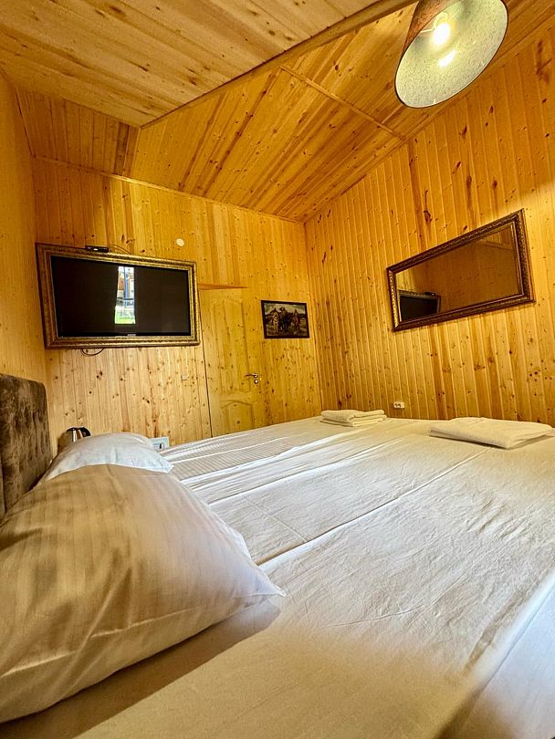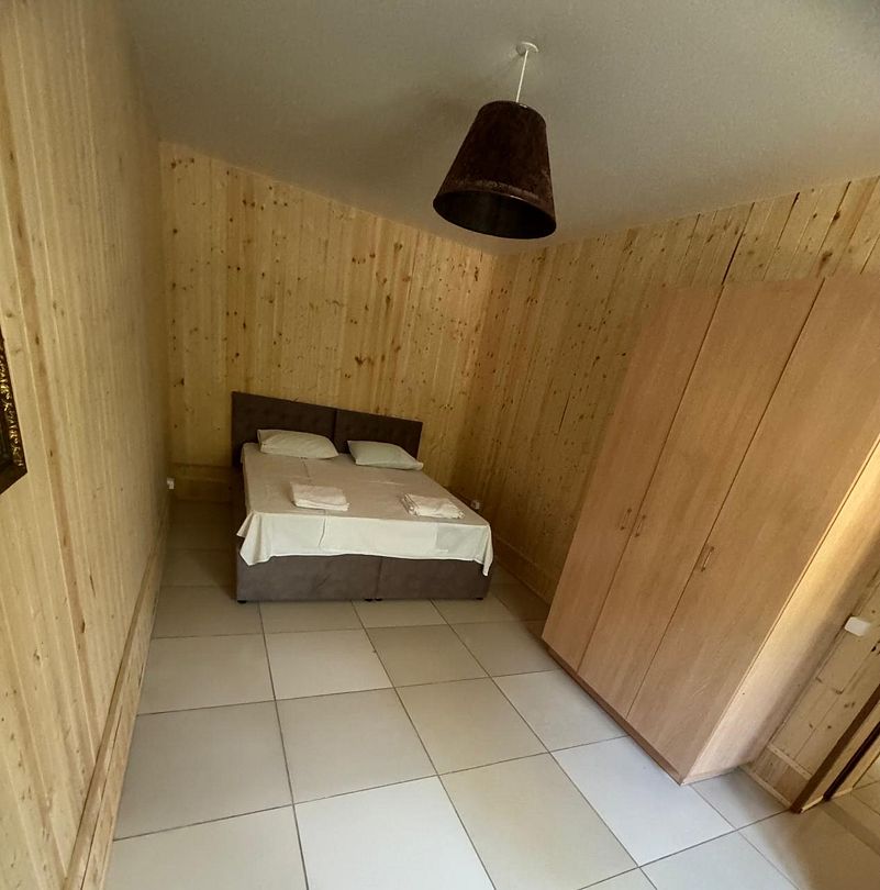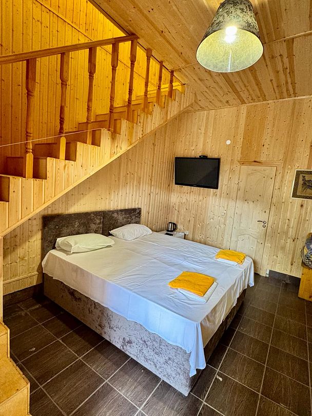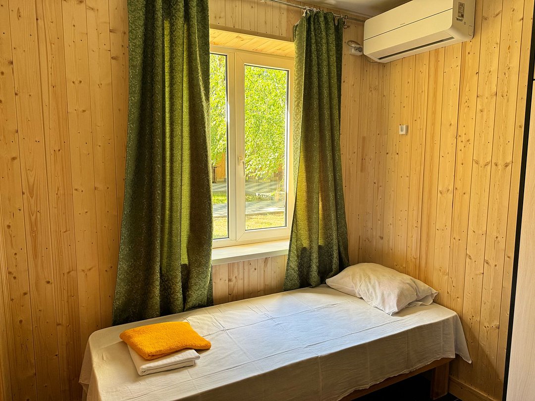 Однокомнатный номер в 4-местном домике оборудован сплит-системой и системой отопления. В доме: кровать двуспальная либо две раздельные, прикроватные тумбочки, телевизор, платяной шкаф, электрочайник (нет питьевой воды), небольшой холодильник.