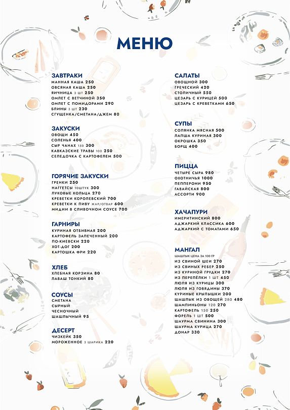 Летний кафе-бар предлагает гостям широкий выбор блюд, включая завтраки, супы, горячие закуски, хачапури и блюда на углях, такие как шашлыки и шаурма.