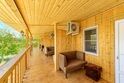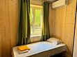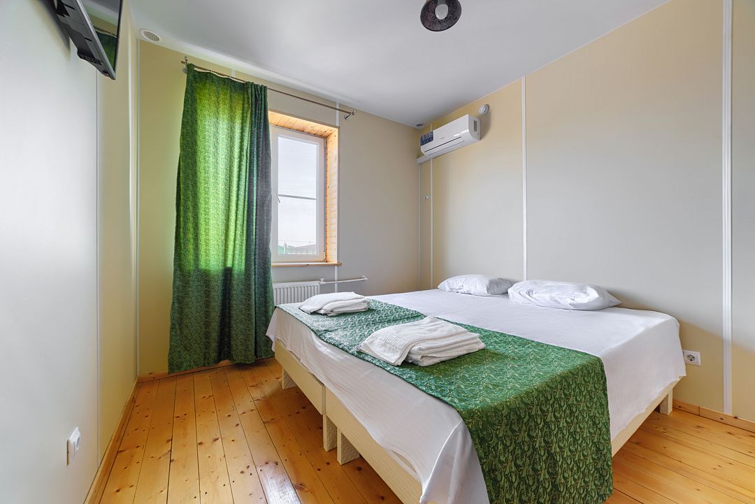 Всего 10 домиков. В домике три комнаты: две спальни и одна общая комната отдыха с раскладным диваном. Каждая из спален оборудована сплит-системой.