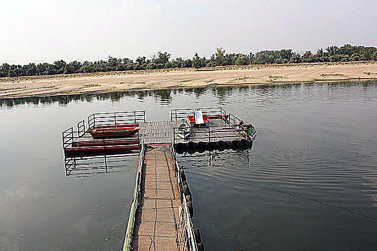 Проехать поселок и понтонный мост через реку Ахтубу.