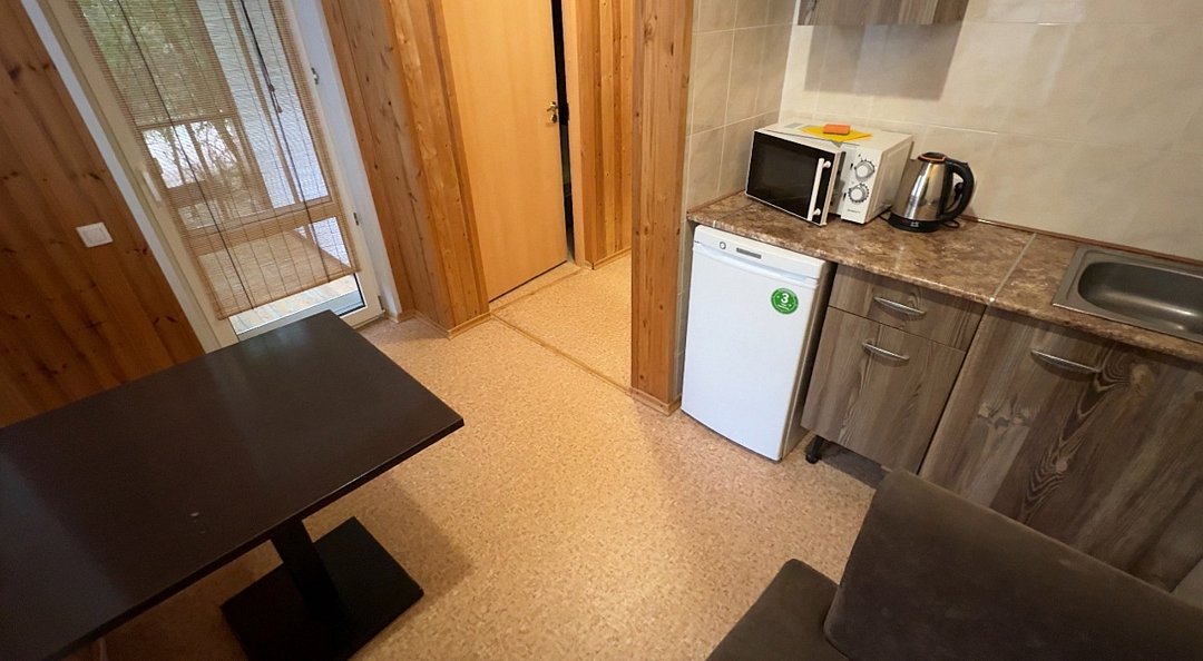 НедостаткиБрали домик на троих для двоих человек, так как нужны были раздельные кровати, второй спал на дополнительном кресле-кровати, расположенном в кухонной зоне. Пришлось сдвинуть стол в угол, тесно и неудобно. Но так то недостатки можно найти везде. Для одно-двух дней отдыха все вполне хорошо.