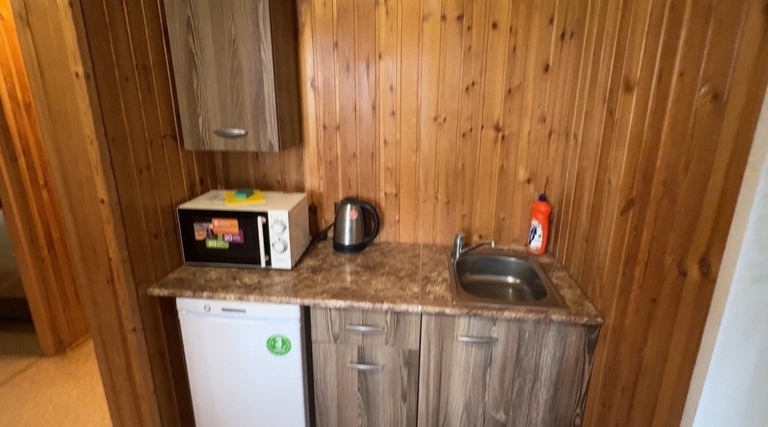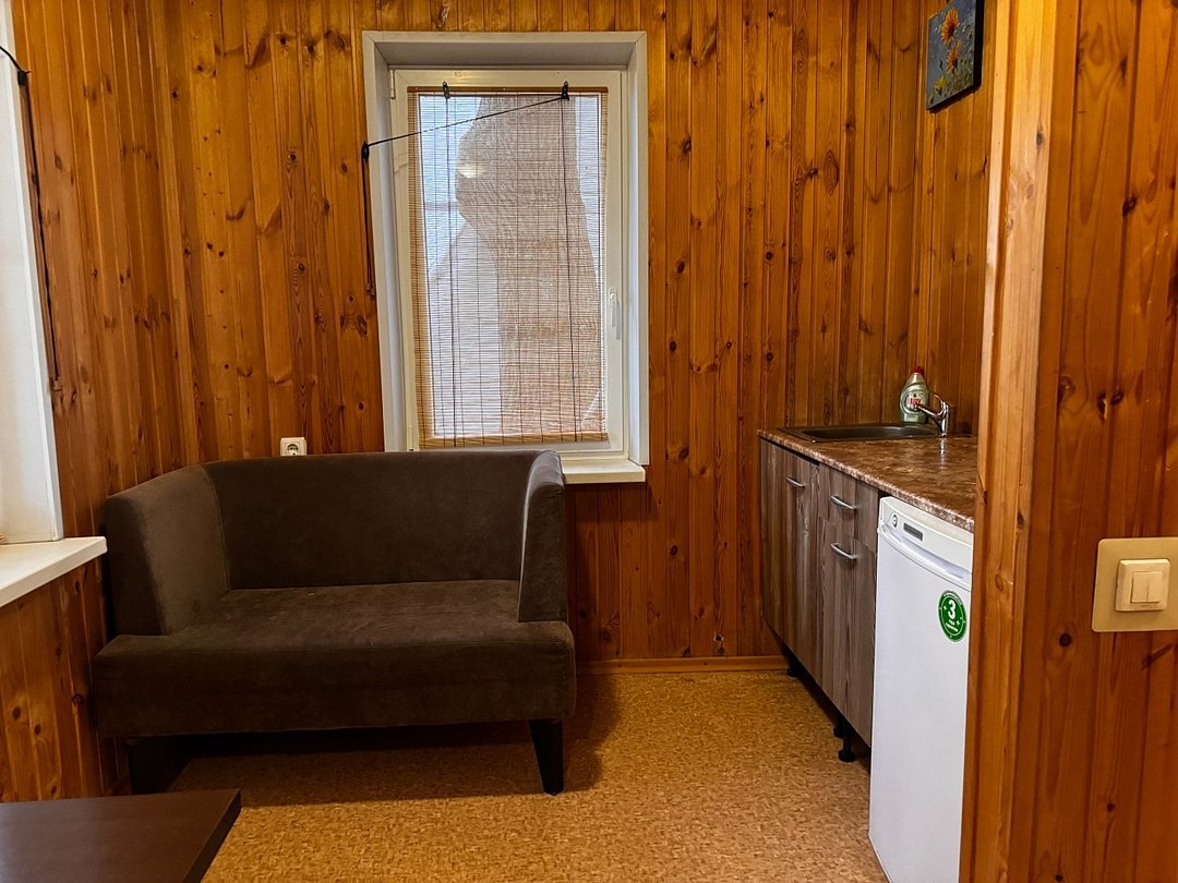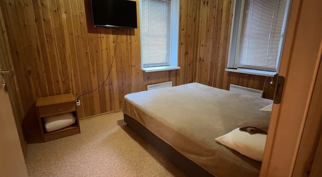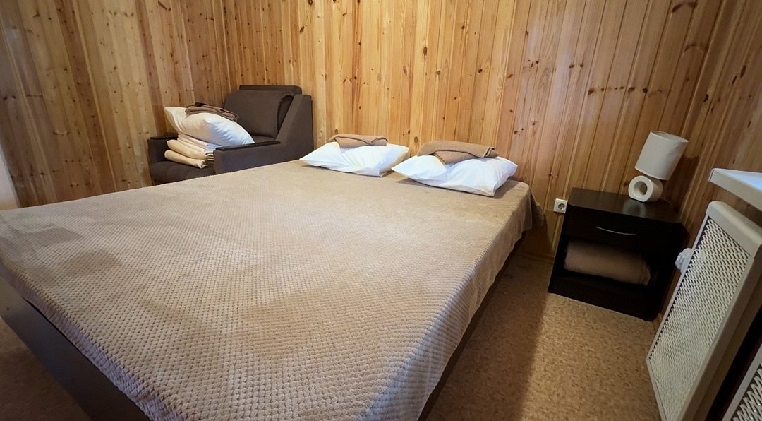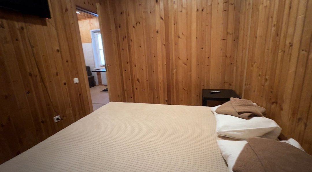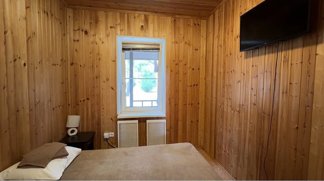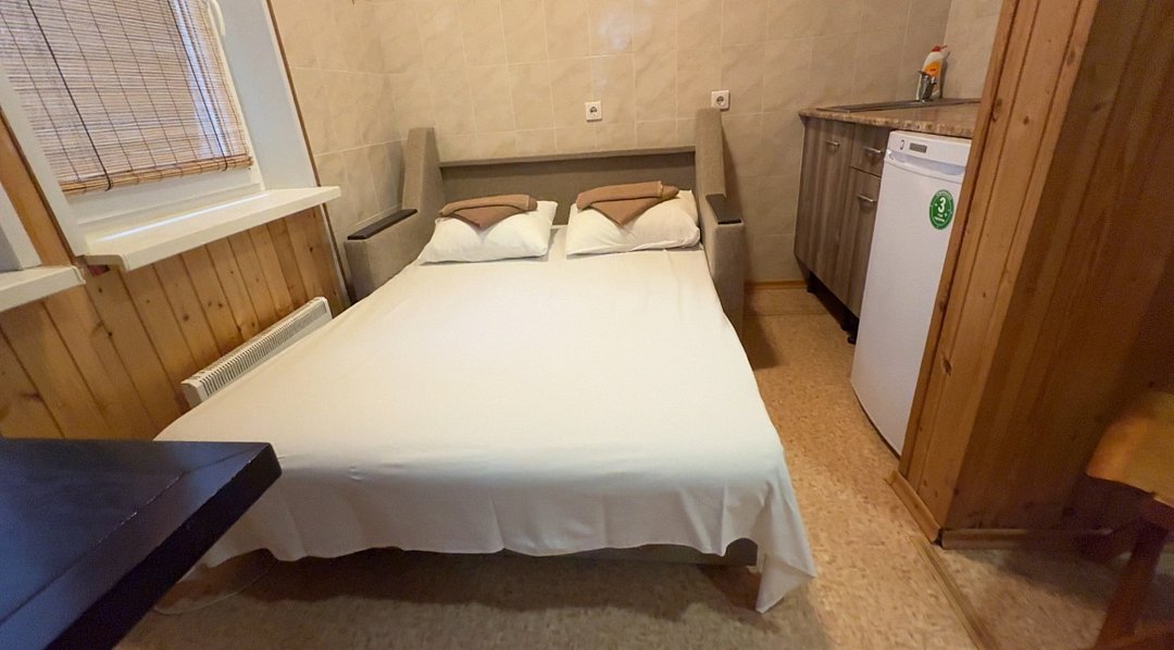 В домике двухместная кровать и кресло-кровать расположен в спальне. В домике: двухместная кровать + кресло-кровать, ТВ, холодильник, чайник, микроволновка, набор посуды, душ, туалет, постельное белье, кондиционер, кухня (без плиты), мангальная зона недалеко домика. Домик хорошо отапливается.