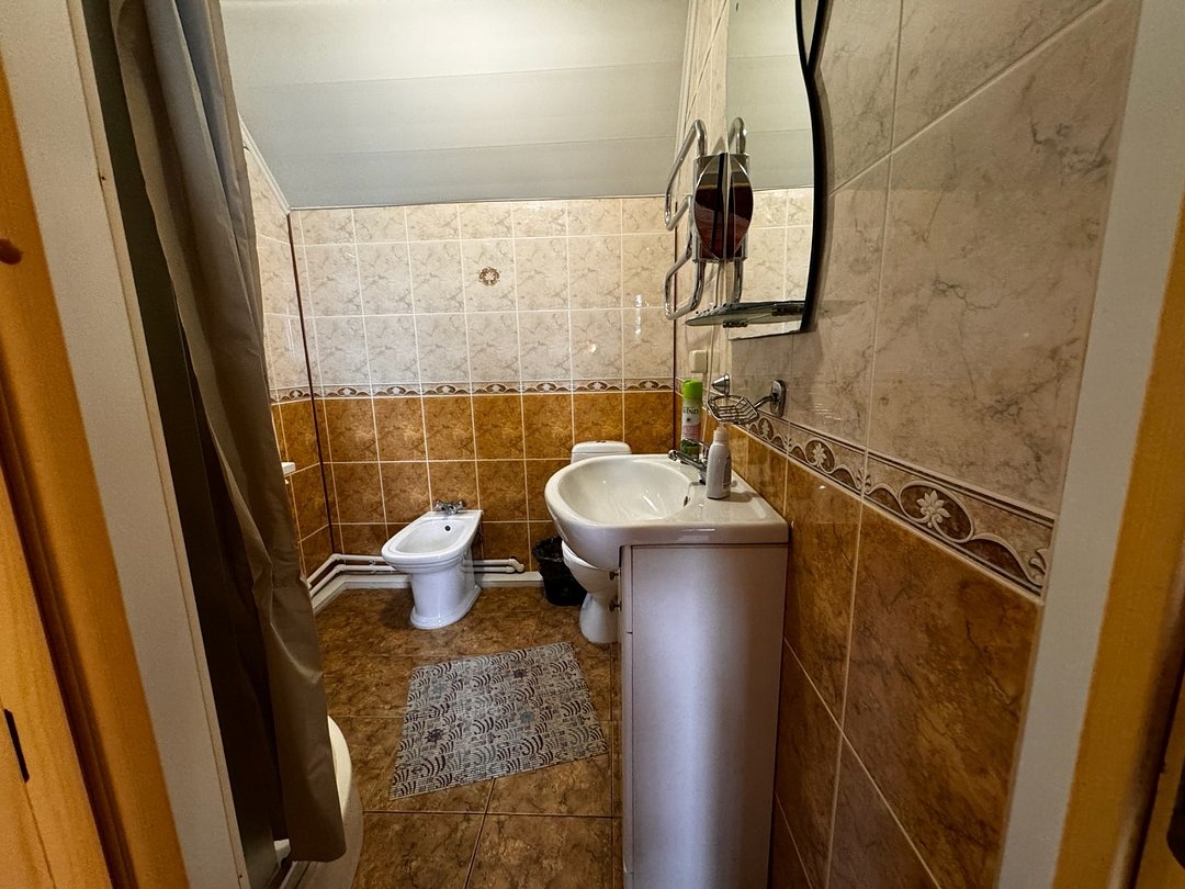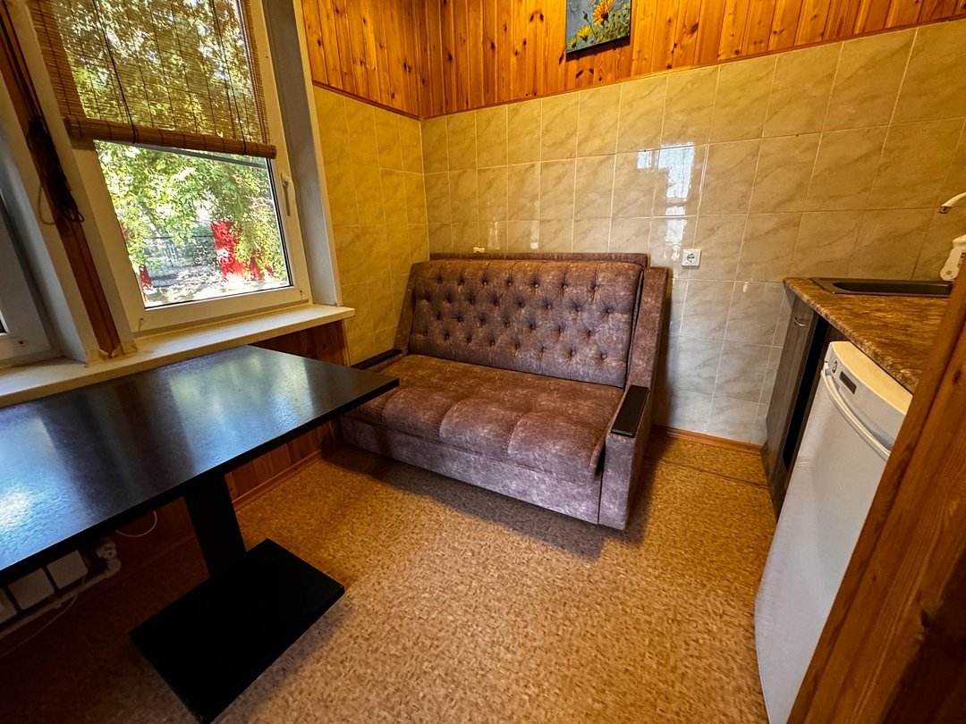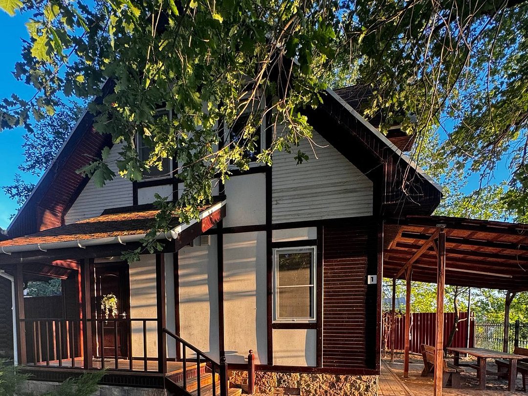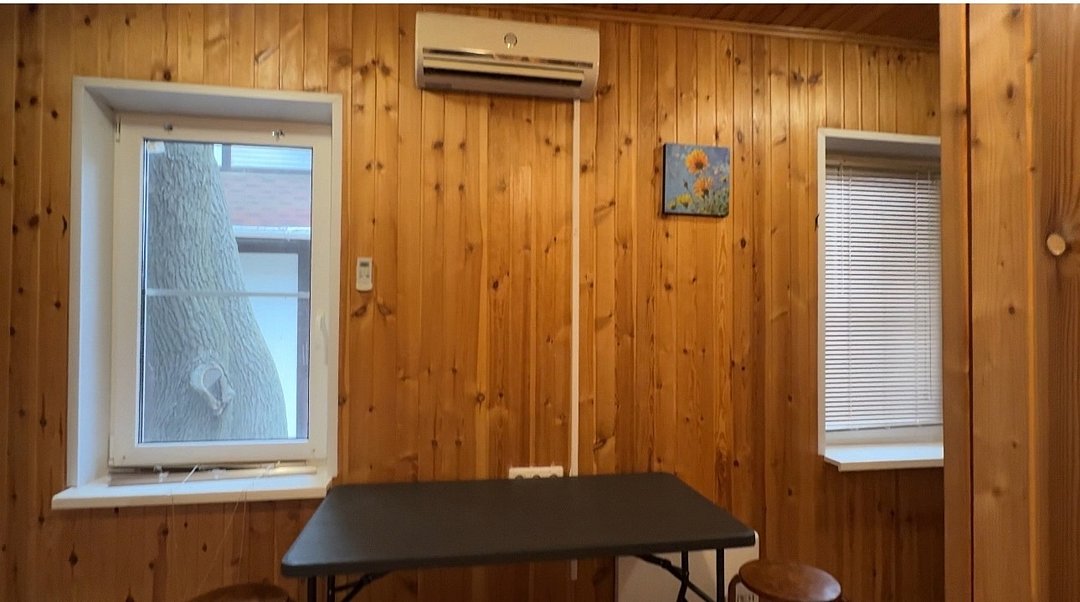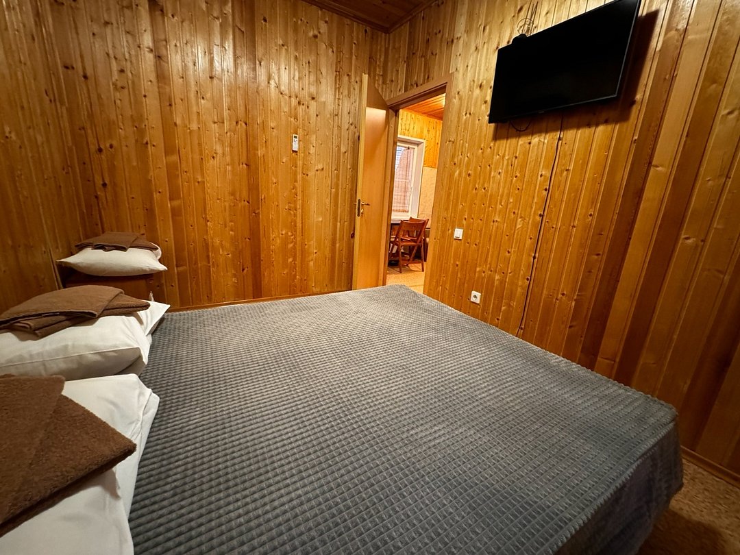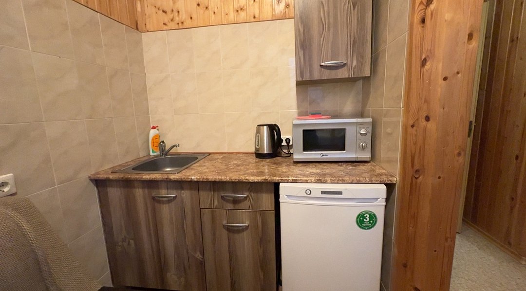 В домике двухместная кровать и кресло-кровать расположен в спальне. В домике: двухместная кровать + кресло-кровать, ТВ, холодильник, чайник, микроволновка, набор посуды, душ, туалет, постельное белье, кондиционер, кухня (без плиты), мангальная зона недалеко домика. Домик хорошо отапливается.