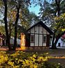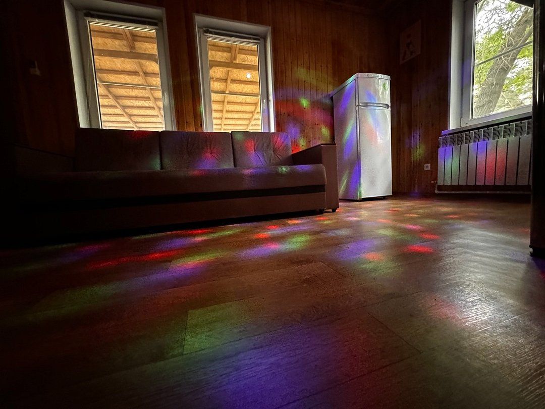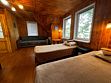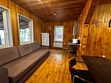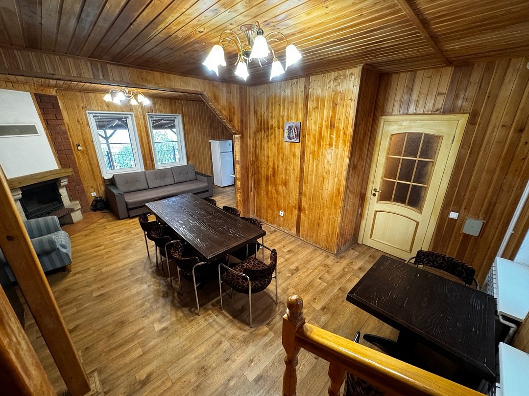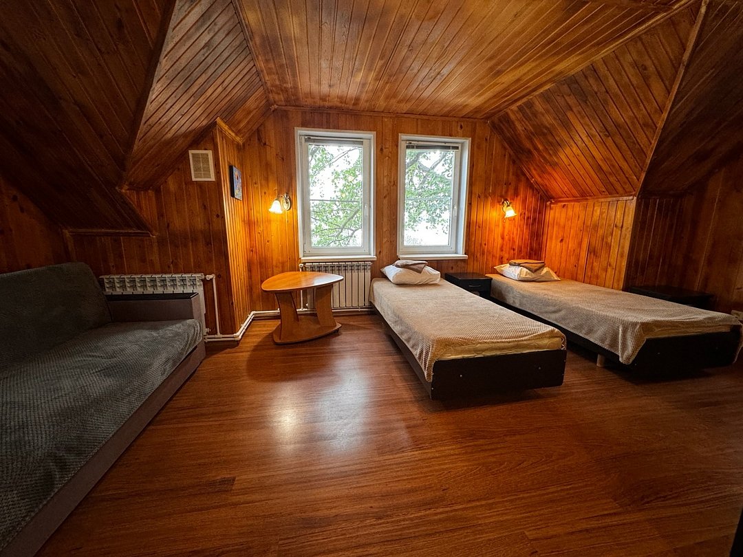 - У дома № 1 — 8 спальных мест: на втором этаже 1 комната на 6 мест (двухместный диван и 4 односпальных кровати, две из которых можно сдвинуть), на первом 2-х местный диван. На первом этаже расположена кухня, объединенная с гостиной и живой камин и небольшая светомузыка. На фото внутри представлен дом номер 1.